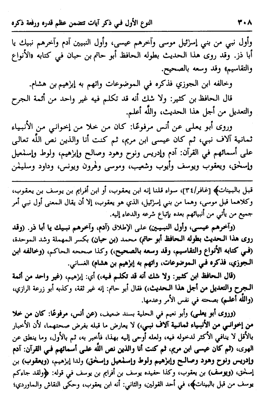 "وآخرهم عيسى، وأول النبيين" على الإطلاق "آدم، وآخرهم نبيك يا أبا ذر". "وقد روى هذا الحديث بطوله الحافظ أبو حاتم" محمد "بن حبان" بكسر المهملة وشد الموحدة، "في كتابه الأنواع والتقاسيم، وقد وسعه بالصحيح" وكذا صححه الحاكم، "وخالفه ابن الجوزي، فذكره في الموضوعات، واتهم به إبراهيم بن هشام" الغساني.