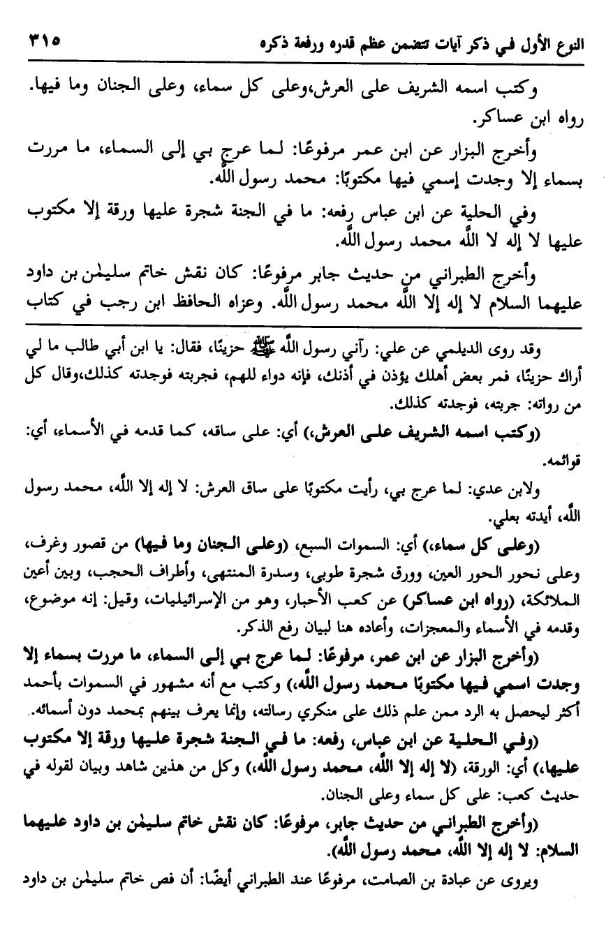 وأخرج البزار عن ابن عمر مرفوعًا: "لما عرج بي إلى السماء، ما مررت بسماء إلا وجدت اسمي فيها مكتوبًا: محمد رسول الله".