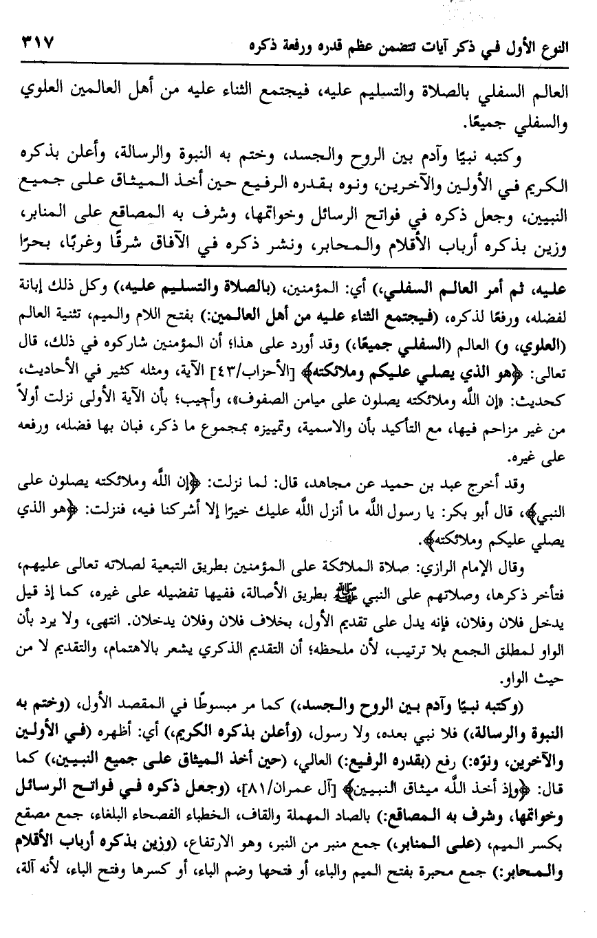 وقال الإمام الرازي: صلاة الملائكة على المؤمنين بطريق التبعية لصلاته تعالى عليهم، فتأخر ذكرها، وصلاتهم على النبي صلى الله عليه وسلم بطريق الأصالة، ففيها تفضيله على غيره، كما إذ قيل يدخل فلان وفلان، فإنه يدل على تقديم الأول، بخلاف فلان وفلان يدخلان. انتهى، ولا يرد بأن الواو لمطلق الجمع بلا ترتيب؛ لأن ملحظه؛ أن التقديم الذكري يشعر بالاهتمام، والتقديم لا من حيث الواو.