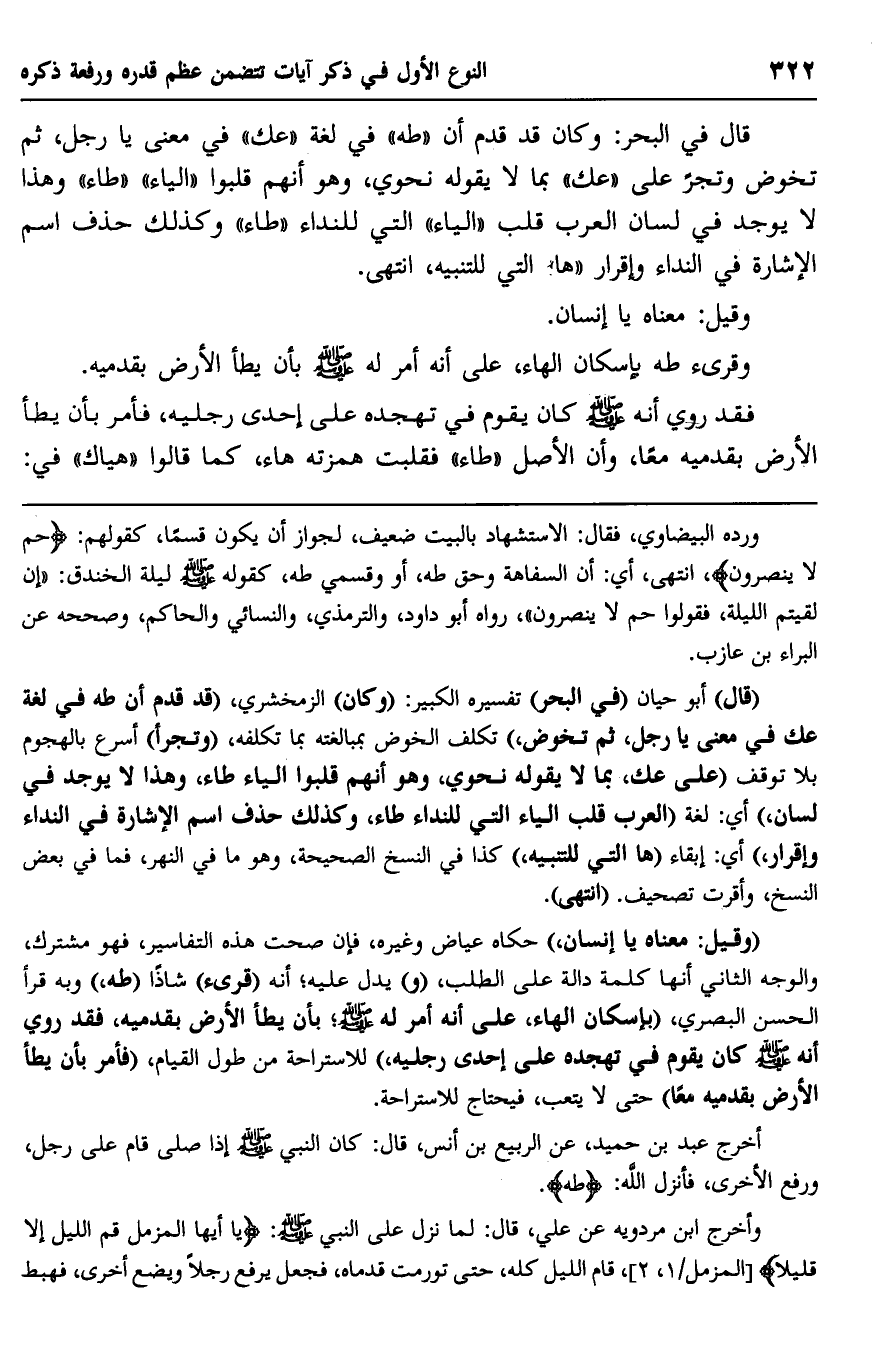 "وقيل: معناه يا إنسان" حكاه عياض وغيره، فإن صحبت هذه التفاسير، فهو مشترك، والوجه الثاني أنها كلمة دالة على الطلب، "و" يدل عليه؛ أنه "قرئ" شاذًا "طه" وبه قرأ الحسن البصري، "بإسكان الهاء، على أنه أمر له صلى الله عليه وسلم؛ بأن يطأ الأرض بقدميه، فقد روي أنه صلى الله عليه وسلم كان يقوم في تهجده على إحدى رجليه" لاستراحة من طول القيام، "فأمر بأن يطأ الأرض بقدميه معًا" حتى لا يتعب، فيحتاج للاستراحة.