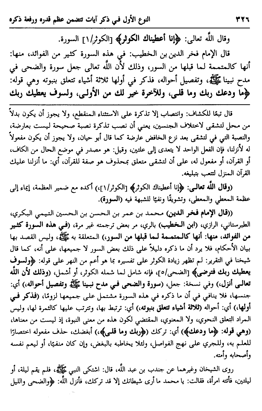 "قال الإمام فخر الدين" محمد بن عمر بن الحسن بن الحسين التيمي البكري، الطبرستاني، الرازي، "ابن الخطيب" بالري، مر بعض ترجمته غير مرة، "في هذه السورة كثير من الفوائد، منها: أنها كالمتممة لما قبلها من السور" المتعلقة به صلى الله عليه وسلم، وليس القصد بها بيان الأحكام، فلا يرد أن ما ذكره دليلًا على ذلك بعض السور لا جميعها، على أنه، كما قال شيخنا في التقرير: لم تظهر زيادة الكوثر على تفسيره، بما هو أعم من النهر على قوله: {وَلَسَوْفَ يُعْطِيكَ رَبُّكَ فَتَرْضَى} [الضحى: 5] فإنه شامل لما شمله الكوثر، أو أشمل، "وذلك؛ لأن الله تعالى أنزل" وفي نسخة: جعل، "سورة والضحى في مدح نبينا صل الله عليه وسلم وتفصيل أحواله" أي: جنسها، فلا ينافي في أن ما ذكره في هذه السورة مشتمل على جميعها لزومًا، "فذكر في أولها" أي: أحواله "ثلاثة أشياء تتعلق بنوبته" أي: ترتبط بها، وتترتب عليها كالثمرة لهان وليس المراد التعلق النحوي، ولا المعنوي، المقتضي لكون هذه من معنى النبوة، إذ ليست من معناها، "وهو قوله: {مَا وَدَّعَك} أي: تركك {رَبُّكَ وَمَا قَلَى} أبغضك، حذف مفعوله اختصارًا للعلم به، وللجري على نهج الفواصل، ولئلا يخاطبه بالبغض، وإن كان منفيًا، أو ليعم نفسه وأصحابه وأمته.