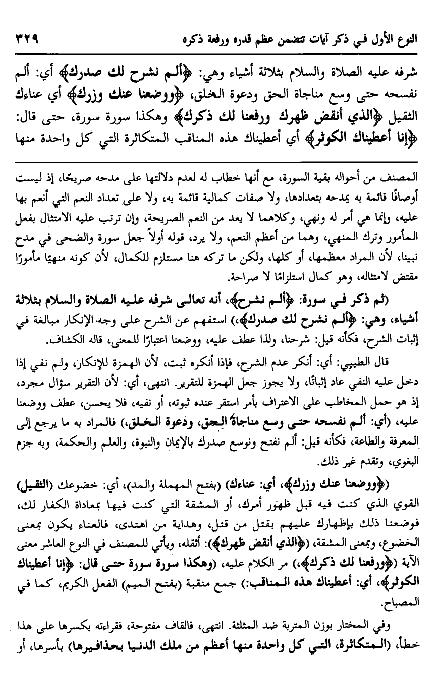 {وَوَضَعْنَا عَنْكَ وِزْرَك} أي: عناءك" "بفتح المهملة والمد" أي: خضوعك "الثقيل" القوي الذي كنت فيه قبل ظهور أمرك، أو المشقة التي كنت فيها بمعاداة الكفار لك، فوضعنا ذلك بإظهارك عليهم بقتل من قتل، وهداية من اهتدى، فالعناء يكون بمعنى الخضوع، وبمعنى المشقة، {الَّذِي أَنْقَضَ ظَهْرَكَ} : أثقله، ويأتي للمصنف في النوع العاشر معنى الآية {وَرَفَعْنَا لَكَ ذِكْرَكَ} مر الكلام عليه، "وهكذا سورة سورة حتى قال: {إِنَّا أَعْطَيْنَاكَ الْكَوْثَر} ، أي: أعطيناك هذه المناقب" جمع منقبة "بفتح الميم" الفعل الكريم، كما في المصباح.