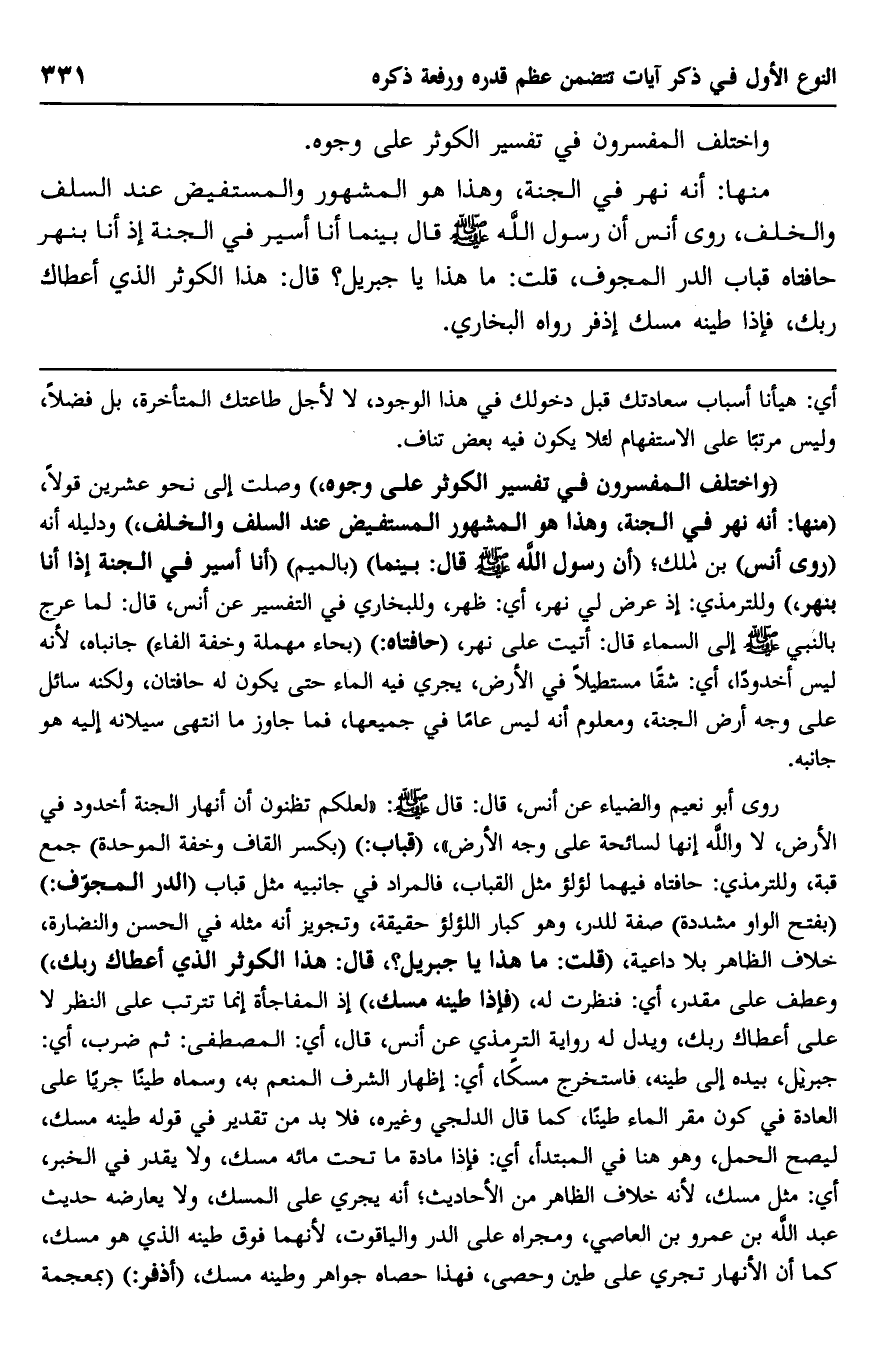 "واختلف المفسرون في تفسير الكوثر على وجوه" وصلت إلى نحو عشرين قولًا، "منها: أنه نهر في الجنة، وهذا هو المشهور المستفيض عند السلف والخلف" ودليله أنه "روى أنس" بن مالك؛ "أن رسول الله صلى الله عليه وسلم قال: "بينما" "بالميم" "أنا أسير في الجنة إذا أنا بنهر" وللترمذي: إذ عرض لي نهر، أي: ظهر، وللبخاري في التفسير عن أنس، قال: لما عرج بالنبي صلى الله عليه وسلم إلى السماء قال: "أتيت على نهر، "حافتاه" "بحاء مهملة وخفة الفاء" جانباه؛ لأنه ليس أخدودًا، أي: شقا مستطيلًا في الأرض، يجري فيه الماء حتى يكون له حافتان، ولكنه سائل على وجه أرض الجنة، ومعلوم أنه ليس عامًا في جميعها، فما جاوز ما انتهى سيلانه إليه هو جانبه.