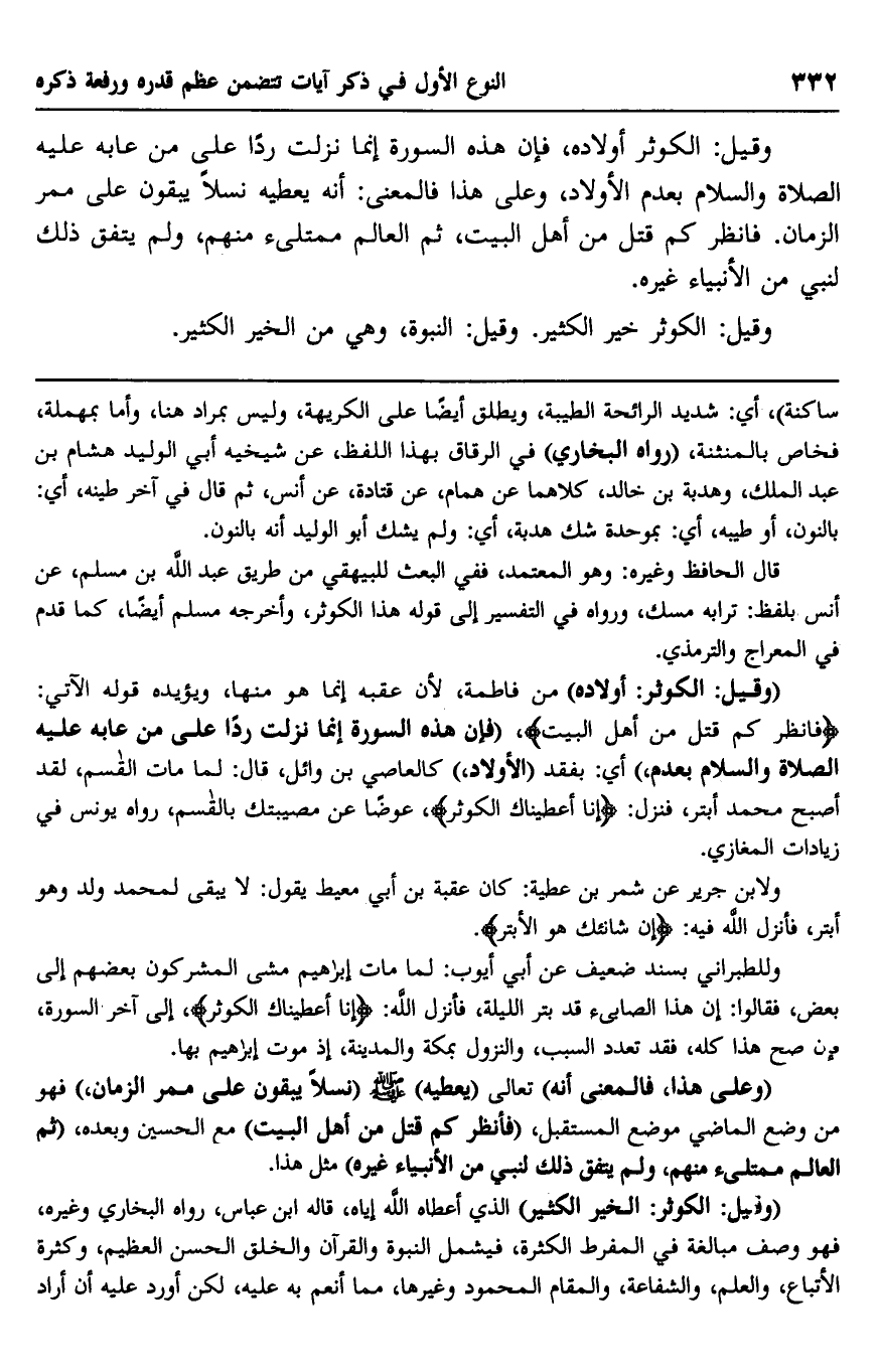 "وقيل: الكوثر: الخير الكثير" الذي أعطاه اليه إياه، قاله ابن عباس، رواه البخاري وغيره، فهو وصف مبالغة في المفرط الكثرة، فيشمل النبوة والقرآن والخلق الحسن العظيم، وكثرة الأتباع، والعلم، والشفاعة، والمقام المحمود وغيرها، مما أنعم به عليه، لكن أورد عليه أن أراد