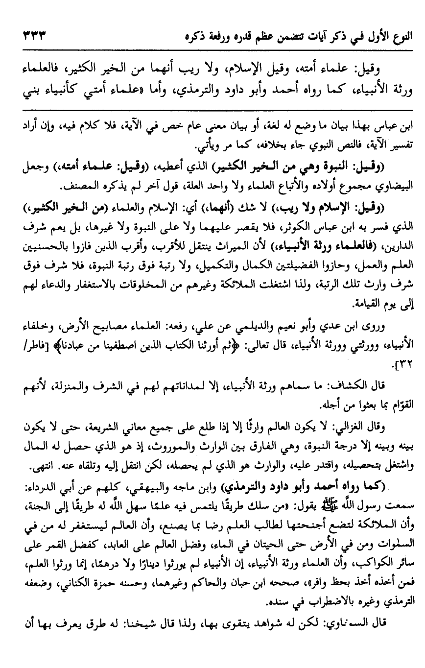وقيل: علماء أمته، وقيل: الإسلام، ولا ريب أنهما من الخير الكثير، فالعلماء ورثة الأنبياء، كما رواه أحمد وأبو داود والترمذي، وأما "علماء أمتي كأنبياء بني