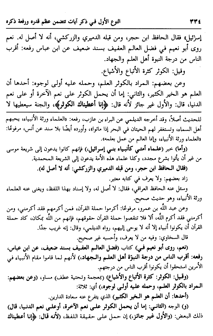 وعن بعضهم: المراد بالكوثر العلم، وحمله عليه أولى لوجوه: أحدها أن العلم هو الخير الكثير، والثاني: إما أن يحمل الكوثر على نعم الآخرة أو على نعم الدنيا، قال: والأول غير جائز؛ لأنه قال: {إِنَّا أَعْطَيْنَاكَ الْكَوْثَر} ، والجنة سيعطيها لا