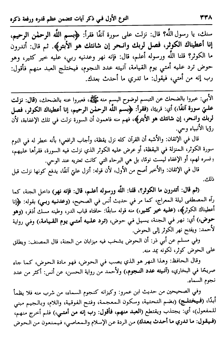 سنك، يا رسول الله؟ قال: "نزلت علي سورة آنفًا فقرأ: بسم الله الرحمن الرحيم: {إِنَّا أَعْطَيْنَاكَ الْكَوْثَرَ، فَصَلِّ لِرَبِّكَ وَانْحَرْ، إِنَّ شَانِئَكَ هُوَ الْأَبْتَرُ} . ثم قال: أتدرون ما الكوثر؟ قلنا: الله ورسوله أعلم، قال: فإنه نهر وعدنيه ربي، عليه خير كثير، وهو حوض ترد عليه أمتي يوم القيامة، آنيته عدد النجوم، فيختلج العبد منهم فأقول: رب إنه من أمتي، فيقول: ما تدري ما أحدث بعدك".