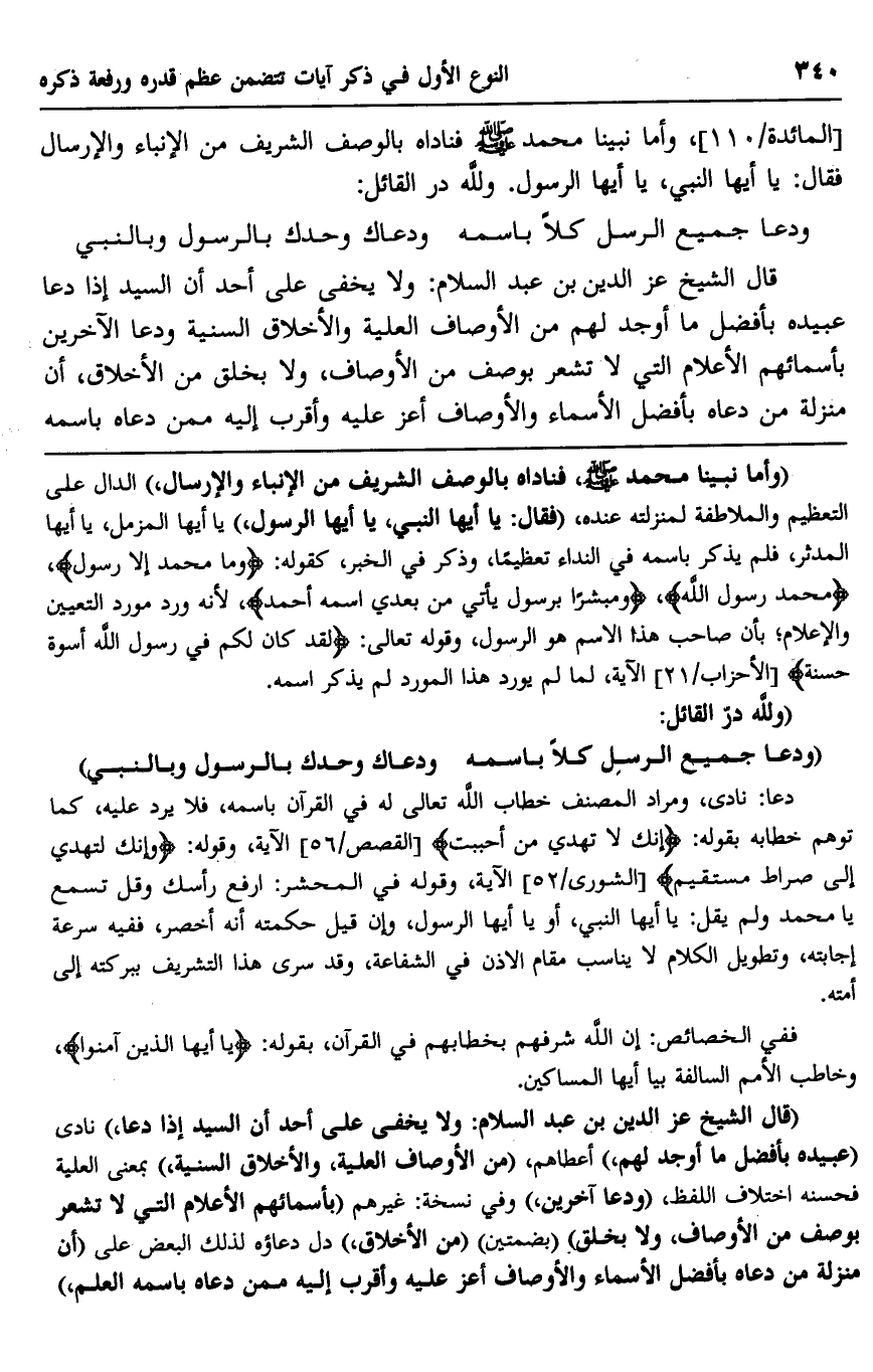 "قال الشيخ عز الدين بن عبد السلام: ولا يخفى على أحد أن السيد إذا دعا"، نادى "عبيده بأفضل ما أوجد لهم" أعطاهم، "من الأوصاف العلية، والأخلاق السنية" بمعنى العلية فحسنه اختلاف اللفظ، "ودعا آخرين" وفي نسخة: غيرهم "بأسمائهم الأعلام التي لا تشعر بوصف من الأوصاف، ولا بخلق" "بضمتين" "من الأخلاق" دل دعاؤه لذلك البعض على "أن منزلة من دعاه بأفضل الأسماء والأوصاف أعز عليه وأقرب إليه ممن دعاه باسمه العلم"،
