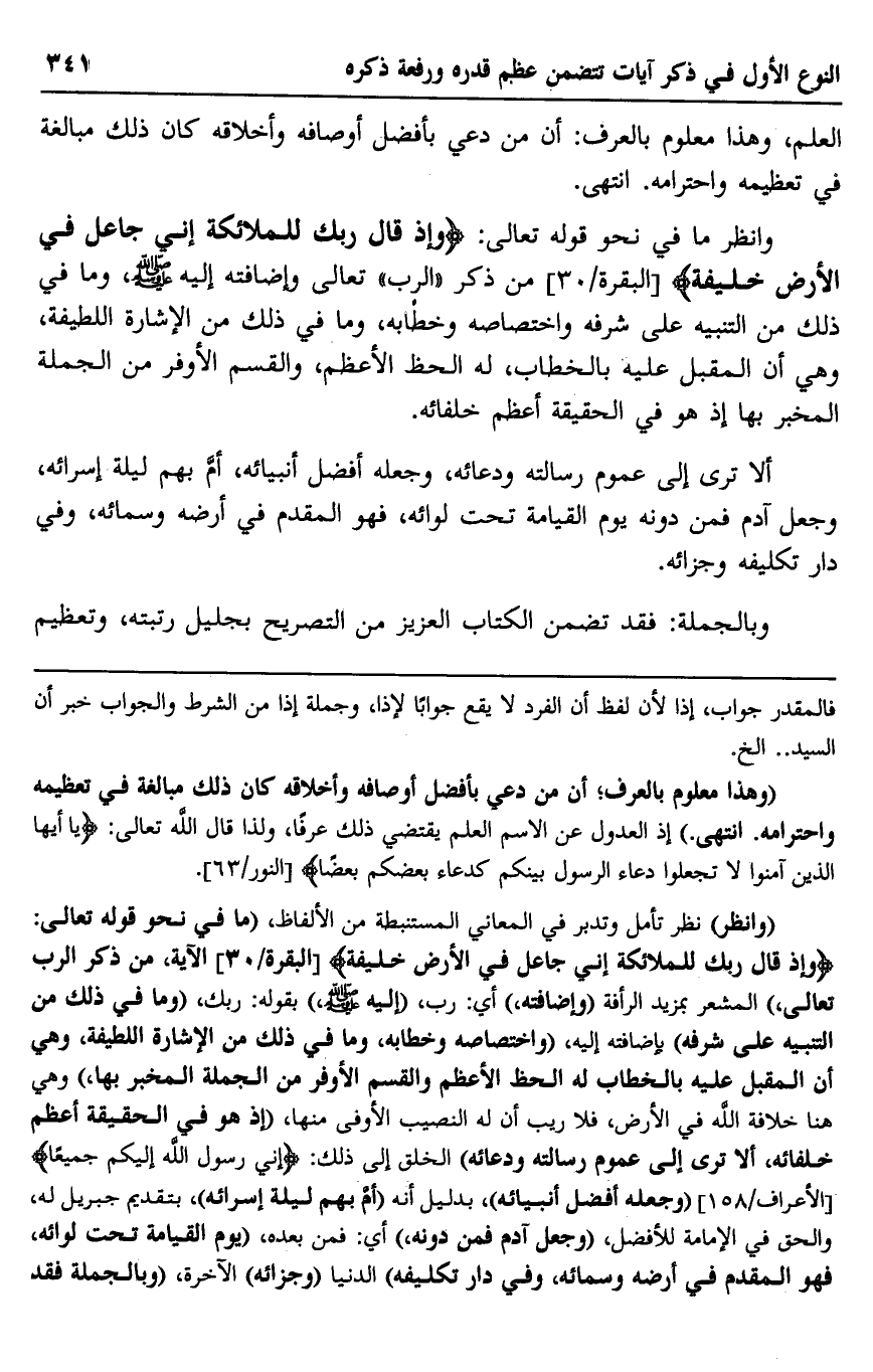 "وانظر" نظر تأمل وتدبر في المعاني المستنبطة من الألفاظ، "ما في نحو قوله تعالى: {وَإِذْ قَالَ رَبُّكَ لِلْمَلَائِكَةِ إِنِّي جَاعِلٌ فِي الْأَرْضِ خَلِيفَةً} [البقرة: 30] الآية، من ذكر الرب تعالى" المشعر بمزيد الرأفة "وإضافته" أي: رب، "إليه صلى الله عليه وسلم" بقوله: ربك، "وما في ذلك من التنبيه على شرفه" بإضافته إليه، "واختصاصه وخطابه، وما في ذلك من الإشارة اللطيفة، وهي أن المقبل عليه بالخطاب له الحظ الأعظم والقسم الأوفر من الجملة المخبر بها"، وهي هنا خلافة الله في الأرض، فلا ريب أن له النصيب الأوفى منها، "إذ هو في الحقيقة أعظم خلفائه، ألا ترى إلى عموم رسالته ودعائه" الخلق إلى ذلك: {إِنِّي رَسُولُ اللَّهِ إِلَيْكُمْ جَمِيعًا} [الأعراف: 158] "وجعله أفضل أنبيائه"، بدليل أنه "أم بهم ليلة إسرائه" بتقديم جبريل له، والحق في الإمامة للأفضل، "وجعل آدم فمن دونه" أي: فمن بعده، "يوم القيامة تحت لوائه، فهو المقدم في أرضه وسمائه، وفي دار تكليفه" الدنيا "وجزائه" الاخرة" وبالجملة فقد