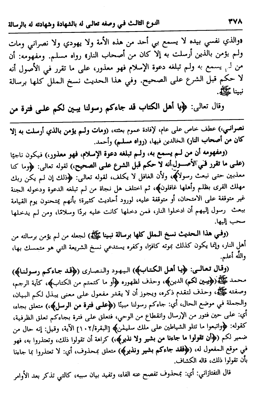 "والذي نفسي بيده لا يسمع بي أحد من هذه الأمة ولا يهودي ولا نصراني، ومات ولم يؤمن بالذي أرسلت به إلا كان من أصحاب النار" رواه مسلم. ومفهومه: أنه من لم يسمع به ولم تبلغه دعوة الإسلام فهو معذور، على ما تقرر في الأصول أنه لا حكم قبل الشرع على الصحيح، وفي هذا الحديث نسخ الملل كلها برسالة نبينا صلى الله عليه وسلم.