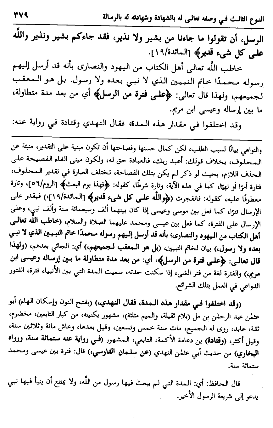 خاطب الله تعالى أهل الكتاب من اليهود والنصارى بأنه قد أرسل إليهم رسوله محمدًا خاتم النبيين الذي لا نبي بعده ولا رسول. بل هو المعقب لجميعهم، ولهذا قال تعالى: {عَلَى فَتْرَةٍ مِنَ الرُّسُلِ} أي من بعد مدة متطاولة، ما بين إرساله وعيسى ابن مريم.