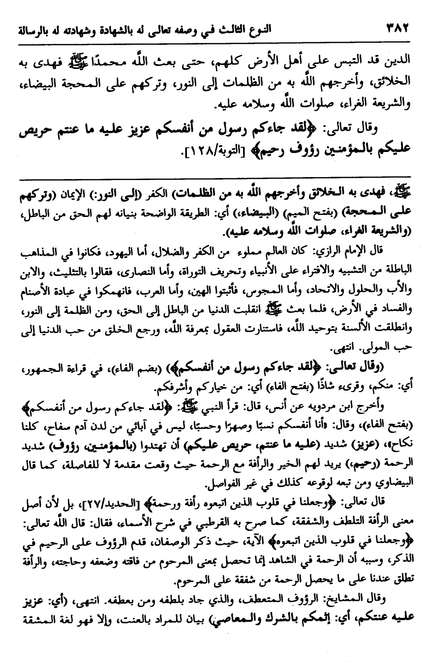 وقال تعالى: {لَقَدْ جَاءَكُمْ رَسُولٌ مِنْ أَنْفُسِكُمْ عَزِيزٌ عَلَيْهِ مَا عَنِتُّمْ حَرِيصٌ عَلَيْكُمْ بِالْمُؤْمِنِينَ رَءُوفٌ رَحِيمٌ} [التوبة: 128] .