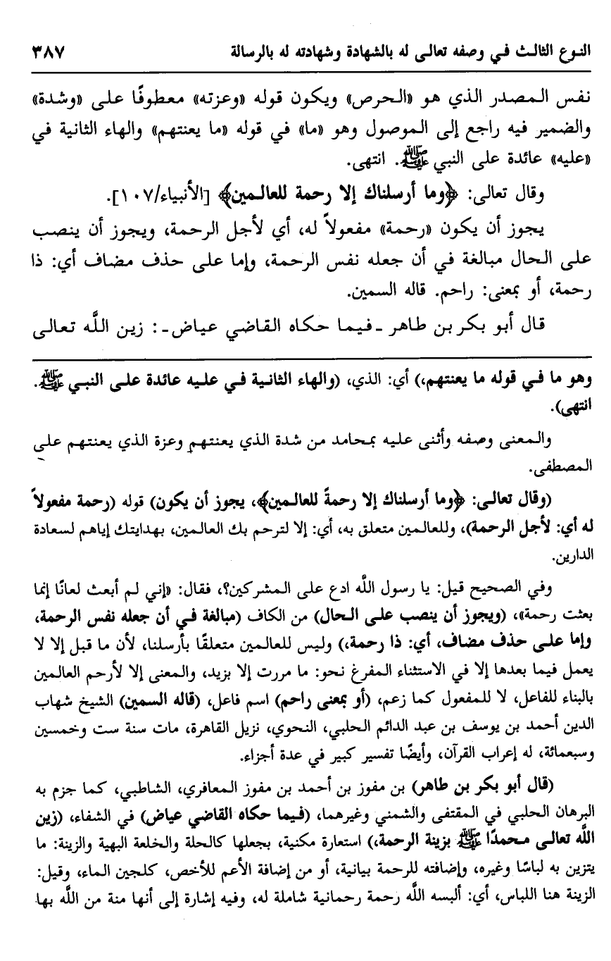 "وقال تعالى: {وَمَا أَرْسَلْنَاكَ إِلَّا رَحْمَةً} ، يجوز أن يكون" قوله: "رحمة مفعولًا له أي: لأجل الرحمة"، وللعالمين متعلق به، أي: إلا لترحم بك العالمين، بهدايتك إياهم لسعادة الدارين.