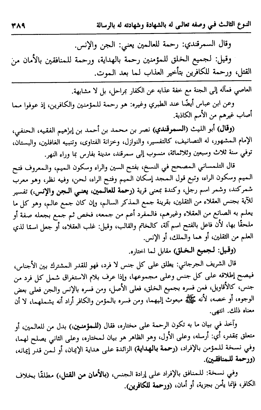 قال التلمساني المصحح في النسخ، بفتح السين والراء وسكون الميم، والمعروف فتح الميم وسكون الراء، وتبع قول المجد إسكان الميم وفتح الراء، لحن، وفيه نظر، وهو معرب شمركند، وشمر اسم رجل، وكندة بمعنى قرية "رحمة للعالمين، يعني الجن والإنس" تفسير للآية بجنس العقلاء من الثقلين، بقرينة جمع المذكر السالم، وإن كان جمع عالم، وهو كل ما يعلم به الصانع من العقلاء وغيرهم، فالمفرد أعم من جمعه، فخص ثم جمع بجعله صفة أو ملحقًا بها؛ لأن فاعل بالفتح اسم آلة، كالخاتم والقالب، وقيل: غلب العقلاء، أو جعل اسمًا لذي العلم من الثقلين، أو هما والملك، أو الإنس.