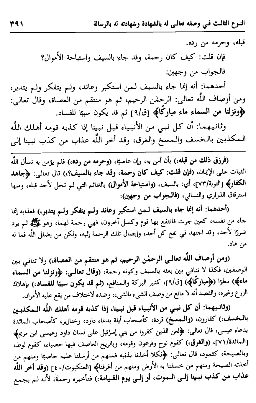 "أحدهما: أنه إنما جاء بالسيف لمن استكبر وعاند ولم يتفكر ولم يتدبر" فعذابه إنما جاء من نفسه، كعين جرت فانتفع بها قوم وكسل آخرون، فهي رحمة لهما، وهو صلى الله عليه وسلم لم يرد ضررًا لأحد، وقد اجتهد في نفع كل أحد، وإيصال تلك الرحمة إليه، ولكن من يضلل الله فما له من هاد.