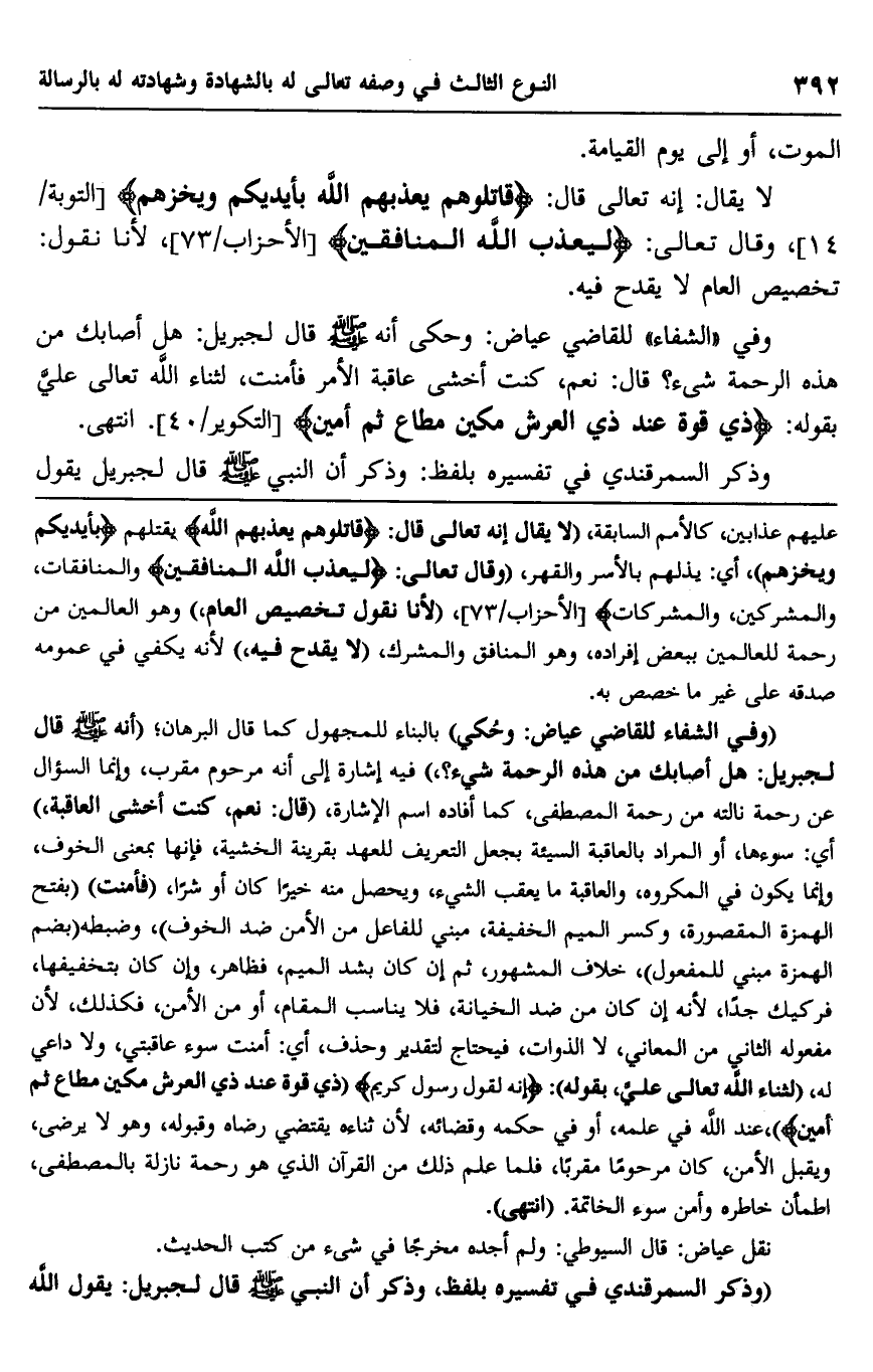 وفي "الشفاء" للقاضي عياض: وحكى أنه صلى الله عليه وسلم قال لجبريل: "هل أصابك من هذه الرحمة شيء؟ قال: نعم، كنت أخشى عاقبة الأمر فأمنت، لثناء الله تعالى علي بقوله: {ذِي قُوَّةٍ عِنْدَ ذِي الْعَرْشِ مَكِينٍ، مُطَاعٍ ثَمَّ أَمِينٍ} " [التكوير: 40] . انتهى.