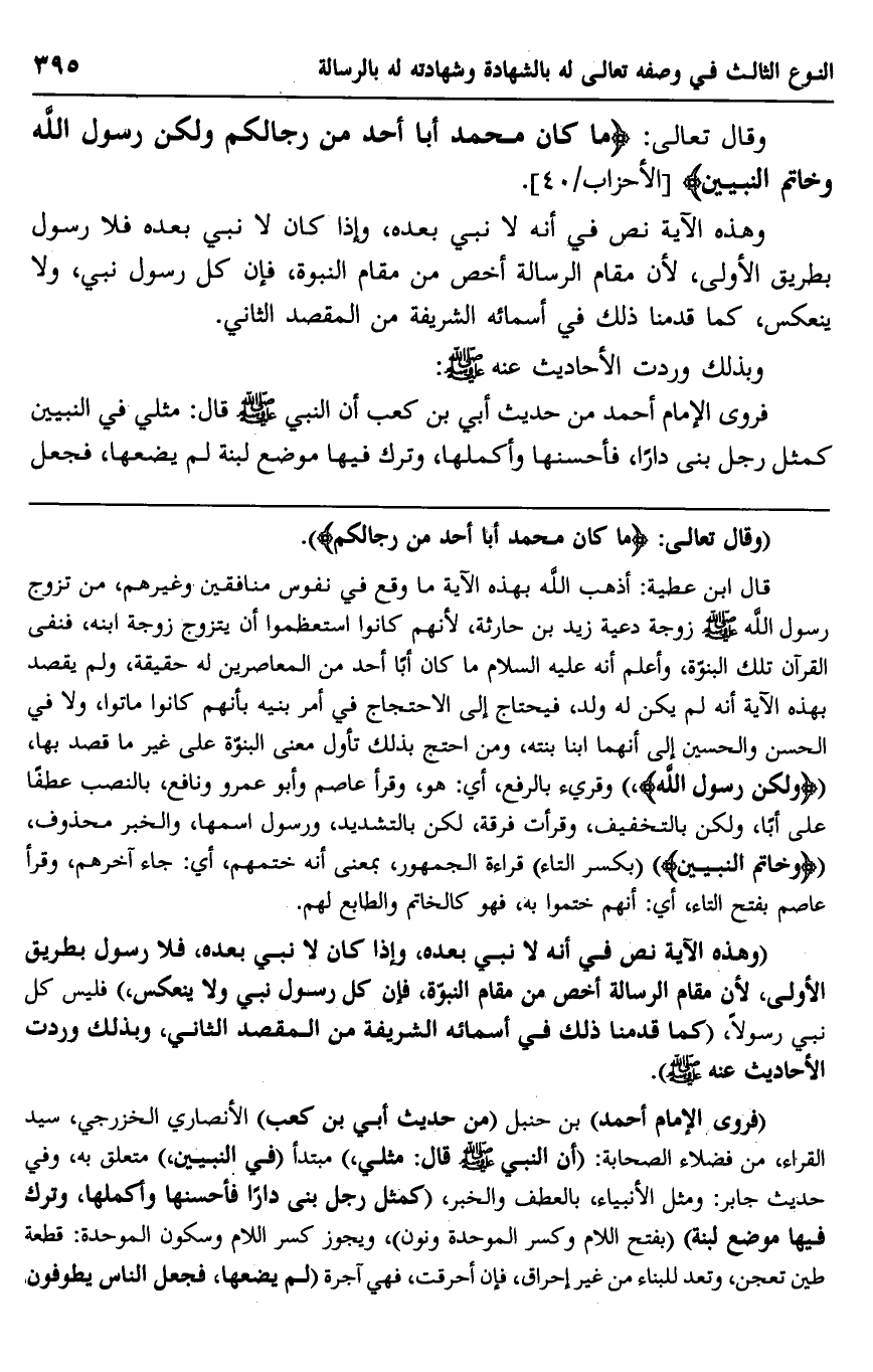 وهذه الآية نص في أنه لا نبي بعده، وإذا كان لا نبي بعده فلا رسول بطريق الأولى؛ لأن مقام الرسالة أخص من مقام النبوة، فإن كل رسول نبي، ولا ينعكس، كما قدمنا ذلك في أسمائه الشريفة من المقصد الثاني.
