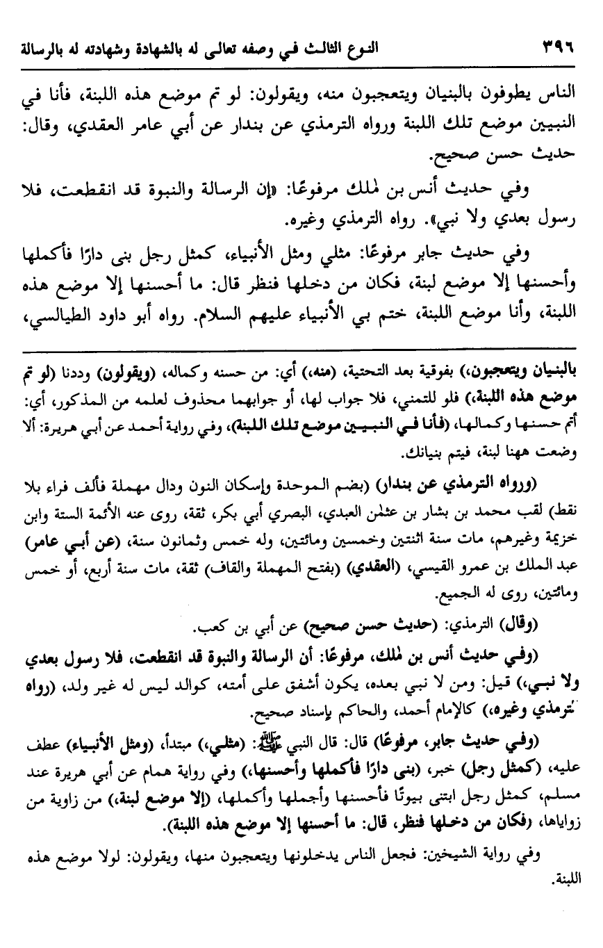 "الناس يطوفون بالبنيان ويتعجبون منه، ويقولون: لو تم موضع هذه اللبنة، فأنا في النبيين موضع تلك اللبنة" ورواه الترمذي عن بندار عن أبي عامر العقدي، وقال: حديث حسن صحيح.