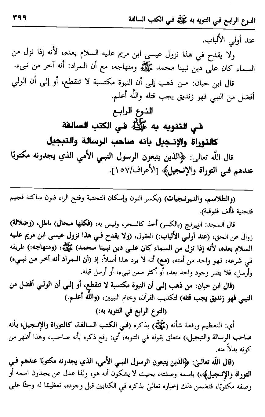 "قال الله تعالى: {الَّذِينَ يَتَّبِعُونَ الرَّسُولَ النَّبِيَّ الْأُمِّيَّ الَّذِي يَجِدُونَهُ مَكْتُوبًا عِنْدَهُمْ فِي التَّوْرَاةِ وَالْإِنْجِيلِ} باسمه وصفته، بحيث لا يشكون أنه هو، ولذا عدل عن يجدون اسمه أو وصفه مكتوبًا، فتضمن ذلك إخباره تعالى بذكره في الكتابين قبل وجوده، تعظيمًا له وحثًا على