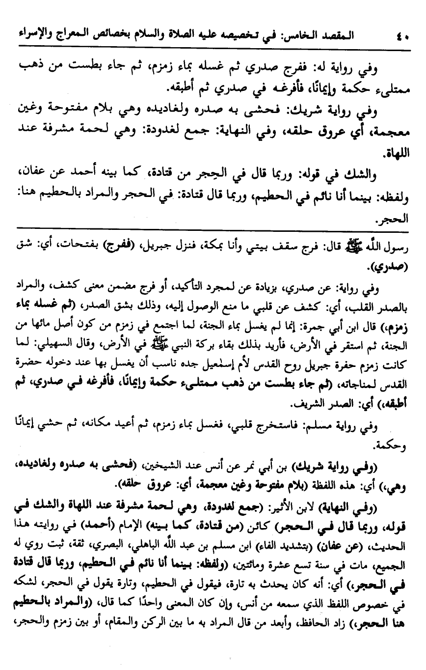 وفي رواية له: "ففرج صدري ثم غسله بماء زمزم، ثم جاء بطست من ذهب ممتلئ حكمة وإيمانًا، فأفرغه في صدري ثم أطبقه".