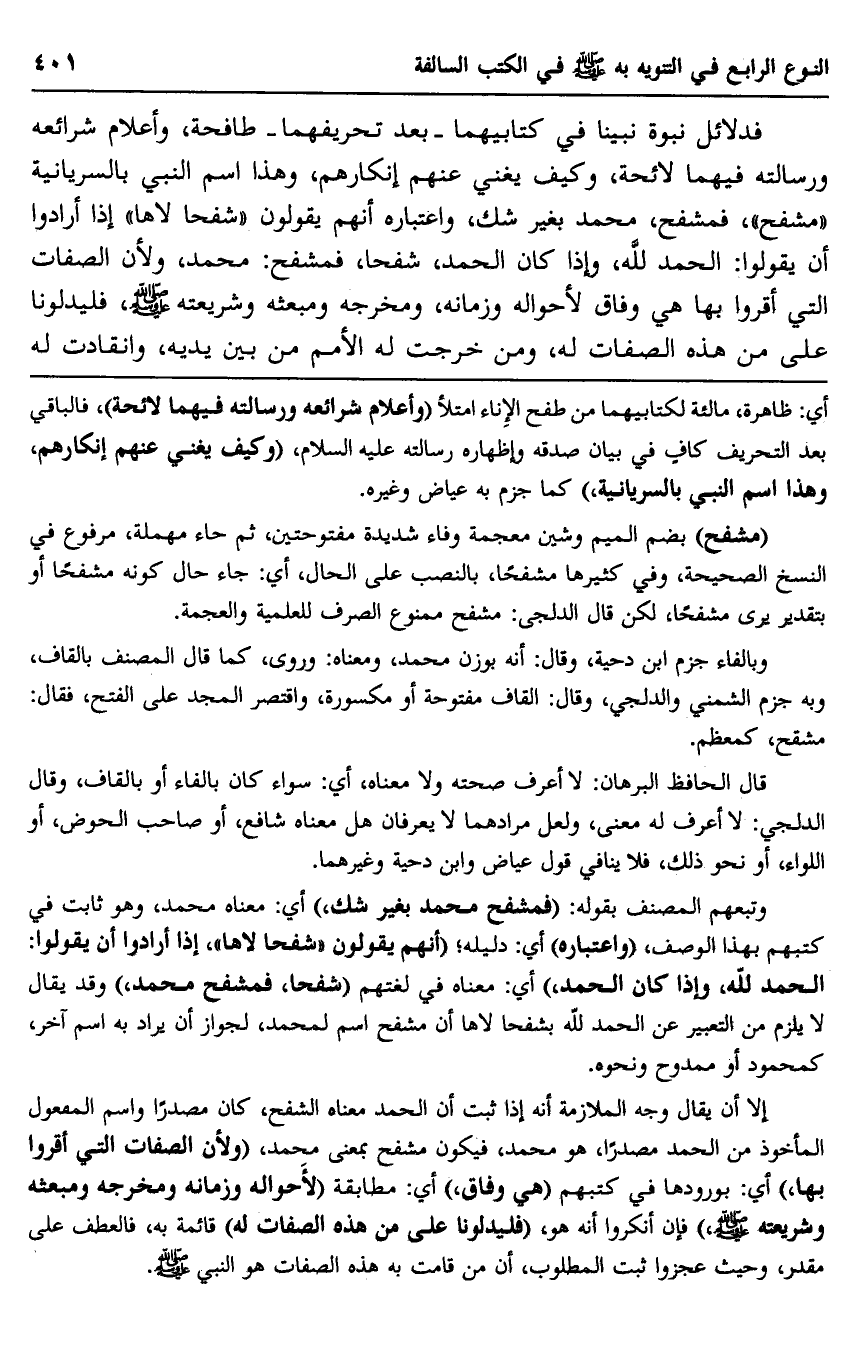 فدلائل نبوة نبينا في كتابيهما -بعد تحريفهما- طافحة، وأعلام شرائعه ورسالته فيهما لائحة، وكيف يغني عنهم إنكارهم، وهذا اسم النبي بالسريانية "مشفح"، فمشفح، محمد بغير شك، واعتباره أنهم يقولون "شفحا لاها" إذا أرادوا أن يقولوا: الحمد لله، وإذا كان الحمد، شفحا، فمشفح: محمد؛ ولأن الصفات التي أقروا بها هي وفاق لأحواله وزمانه، ومخرجه ومبعثه وشريعته صلى الله عليه وسلم، فليدلونا على من هذه الصفات له، ومن خرجت له الأمم من بين يديه، وانقادت له