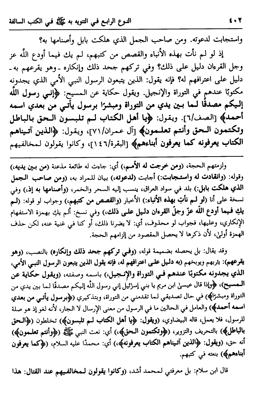 إذ لو لم نأت بهذه الأنباء والقصص من كتبهم، لم يك فيما أودع الله عز وجل القرآن دليل على ذلك؟ وفي تركهم جحد ذلك وإنكاره -وهو يقرعهم به- دليل على اعترافهم له؟ فإنه يقول: {الَّذِينَ يَتَّبِعُونَ الرَّسُولَ النَّبِيَّ الْأُمِّيَّ الَّذِي يَجِدُونَهُ مَكْتُوبًا عِنْدَهُمْ فِي التَّوْرَاةِ وَالْإِنْجِيلِ} ، ويقول حكاية عن المسيح: {إِنِّي رَسُولُ اللَّهِ إِلَيْكُمْ مُصَدِّقًا لِمَا بَيْنَ يَدَيَّ مِنَ التَّوْرَاةِ وَمُبَشِّرًا بِرَسُولٍ يَأْتِي مِنْ بَعْدِي اسْمُهُ أَحْمَدُ} [الصف: 6] . ويقول: {يَا أَهْلَ الْكِتَابِ لِمَ تَلْبِسُونَ الْحَقَّ بِالْبَاطِلِ وَتَكْتُمُونَ الْحَقَّ وَأَنْتُمْ تَعْلَمُونَ} [آل عمران: 71] ، ويقول: {الَّذِينَ آتَيْنَاهُمُ الْكِتَابَ يَعْرِفُونَهُ كَمَا يَعْرِفُونَ أَبْنَاءَهُمُ} [البقرة: 146] ، وكانوا يقولون لمخالفيهم