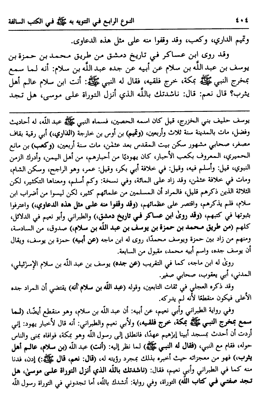وقد روى ابن عساكر في تاريخ دمشق من طريق محمد بن حمزة بن يوسف بن عبد الله بن سلام عن أبيه عن جده عبد الله بن سلام: أنه لما سمع بمخرج النبي صلى الله عليه وسلم بمكة، خرج فلقيه، فقال له النبي صلى الله عليه وسلم: "أنت ابن سلام عالم أهل يثرب"؟ قال نعم: قال: "ناشدتك بالله الذي أنزل التوراة على موسى، هل تجد