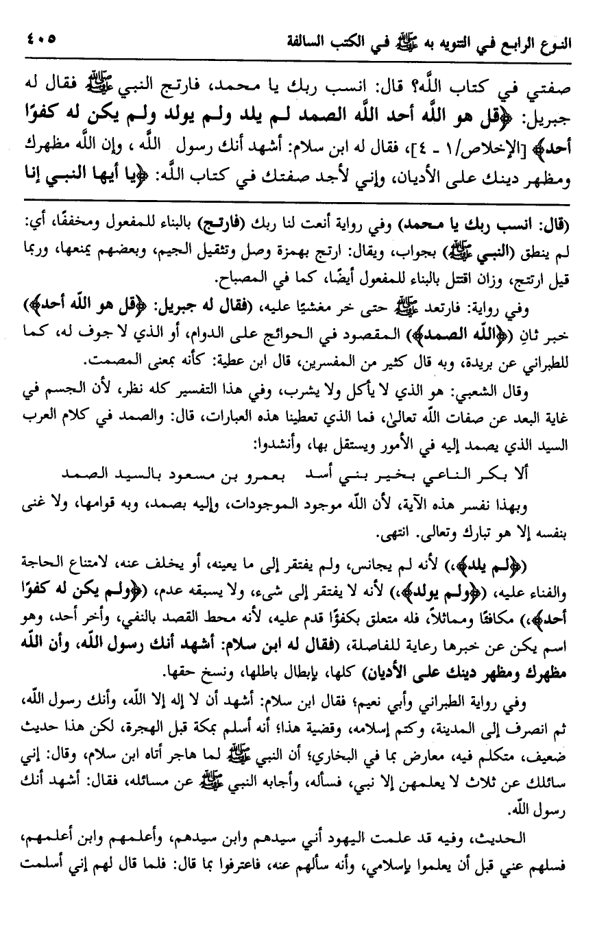 "صفتي في كتاب الله"؟ قال: انسب ربك يا محمد، فارتج النبي صلى الله عليه وسلم فقال له جبريل: {قُلْ هُوَ اللَّهُ أَحَدٌ، اللَّهُ الصَّمَدُ، لَمْ يَلِدْ وَلَمْ يُولَدْ، وَلَمْ يَكُنْ لَهُ كُفُوًا أَحَدٌ} " [الإخلاص: 1-4] ، فقال له ابن سلام: أشهد أنك رسول الله، وإن الله مظهرك ومظهر دينك على الأديان، وإني لأجد صفتك في كتاب الله: {يَا أَيُّهَا النَّبِيُّ إِنَّا