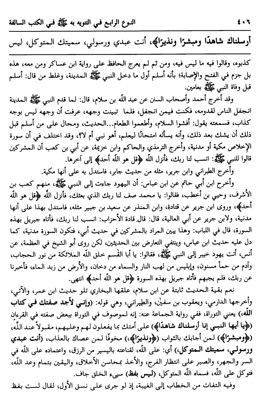 أَرْسَلْنَاكَ شَاهِدًا وَمُبَشِّرًا وَنَذِيرًا} ، أنت عبدي ورسولي، سميتك المتوكل، ليس