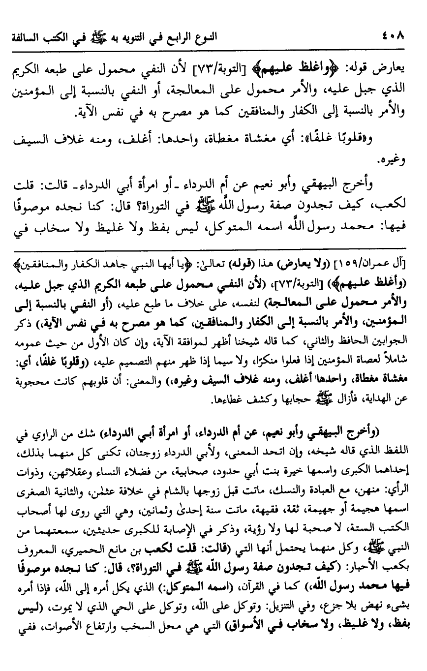 وأخرج البيهقي وأبو نعيم عن أم الدرداء -أو امرأة أبي الدرداء- قالت: قلت لكعب، كيف تجدون صفة رسول الله صلى الله عليه وسلم في التوراة؟ قال: كنا نجده موصوفًا فيها: محمد رسول الله اسمه المتوكل، ليس بفظ ولا غليظ ولا سخاب في
