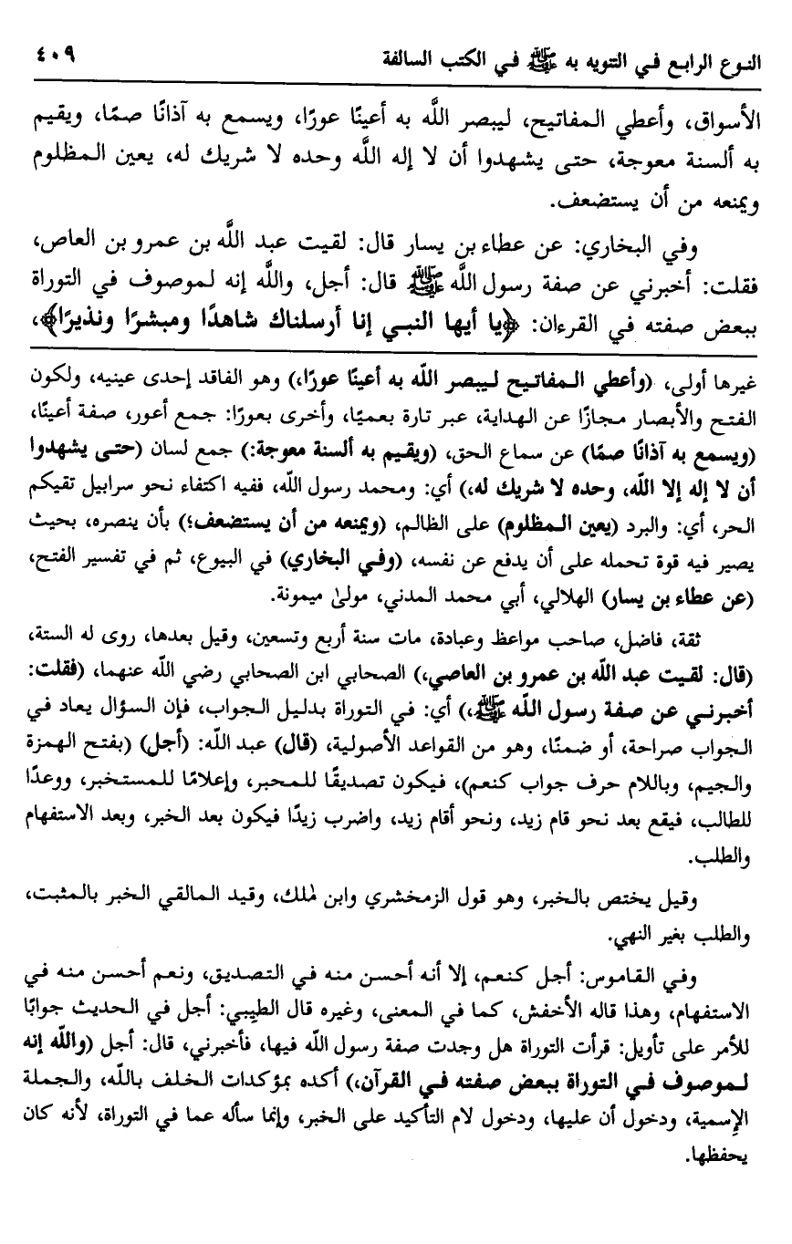 وفي البخاري: عن عطاء بن يسار قال: لقيت عبد الله بن عمرو بن العاص، فقلت: أخبرني عن صفة رسول الله صلى الله عليه وسلم قال: أجل، والله إنه لموصوف في التوراة ببعض صفته في القرآن: {يَا أَيُّهَا النَّبِيُّ إِنَّا أَرْسَلْنَاكَ شَاهِدًا وَمُبَشِّرًا وَنَذِيرًا} ،