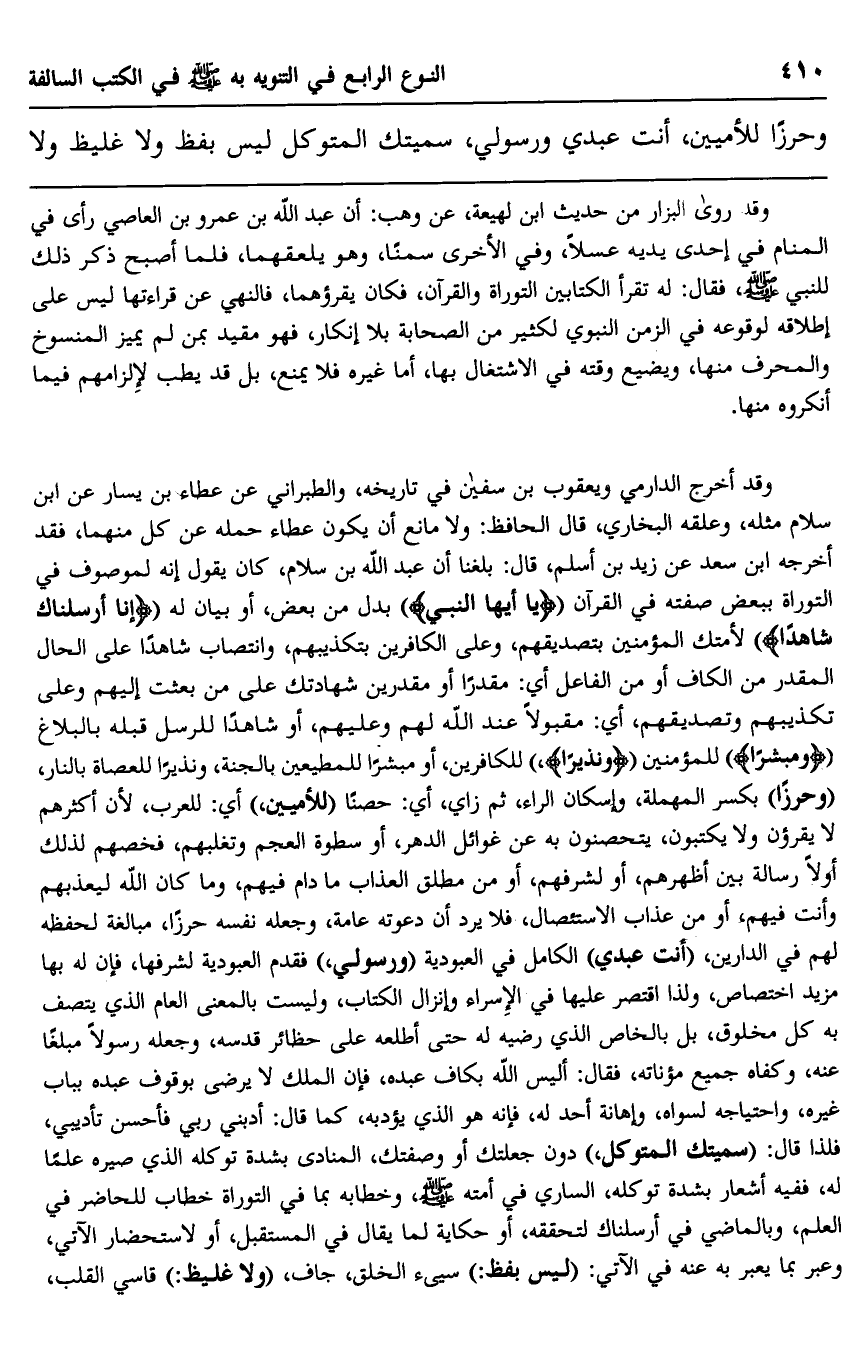 وقد أخرج الدارمي ويعقوب بن سفيان في تاريخه، والطبراني عن عطاء بن يسار عن ابن سلام مثله، وعلقمة البخاري، قال الحافظ: ولا مانع أن يكون عطاء حمله عن كل منهما، فقد أخرجه ابن سعد عن زيد بن أسلم، قال: بلغنا أن عبد الله بن سلام، كان يقول: إنه لموصوف في التوراة ببعض صفته في القرآن {يَا أَيُّهَا النَّبِيُّ} بدل من بعض، أو بيان له {إِنَّا أَرْسَلْنَاكَ شَاهِدًا} لأمتك المؤمنين بتصديقهم، على الكافرين بتكذيبهم، وانتصاب شاهدًا على الحال المقدر من الكاف أو من الفاعل أي: مقدرًا أومقدرين شهادتك على من بعثت إليهم وعلى تكذيبهم وتصديقهم، أي: مقبولًا عند الله لهم وعليهم، أو شاهدًا للرسل قبله بالبلاغ {وَمُبَشِّرًا} للمؤمنين {وَنَذِيرًا} للكافرين، أو مبشرًا للمطيعين بالجنة، ونذيرًا للعصاة بالنار، "وحرزًا" بكسر المهملة، وإسكان الراء، ثم زاي، أي: حصنًا "للأميين" أي: للعرب؛ لأن أكثرهم لا يقرؤون ولا يكتبون، يتحصنون به عن غوائل الدهر، أ, سطوة العجم وتغلبهم، فخصهم لذلك أولًا رسالة بين أظهرهم، أو لشرفهم، أو من مطلق العذب ما دام فيهم، وما كان الله ليعذبهم وأنت فيهم، أو من عذاب الاستئصال، فلا يرد أن دعوته عامة، وجعله نفسه حرزًا، مبالغة لحفظه لهم في الدارين، "أنت عبدي" الكامل في العبودية "ورسولي" فقدم العبودية لشرفها، فإن له بها مزيد اختصاص، ولذا اقتصر عليها في الإسراء وإنزال الكتاب، وليست بالمعنى العام الذي يتصف به كل مخلوق، بل بالخاص الذي رضيه له حتى أطلعه على حظائر قدسه، وجعله رسولًا مبلغًا عنه، وكفاء جميع مؤناته، فقال: أليس الله بكاف عبده، فإن الملك لا يرضى بوقوف عبده بباب غيره، واحتياجه لسواه، وإهانة أحد له، فإنه هو الذي يؤدبه، كما قال: أدبني ربي فأحسن تأديبي، فلذا قال: "سميتك المتوكل" دون جعلتك أو وصفتك، المنادى بشدة توكله الذي صيره علمًا له، ففيه أشعار بشدة توكله، الساري في أمته صلى الله عليه وسلم، وخطابه بما في التوراة خطاب للحاضر في العلم، وبالماضي في أرسلناك لتحققه، أو حكاية لما يقال في المستقبل؛ أو لاستحضار الآتي، وعبر بما يعبر به عنه في الآتي: "ليس بلفظ" سيئ الخلق، جاف، "ولا غليظ" قاسي القلب،