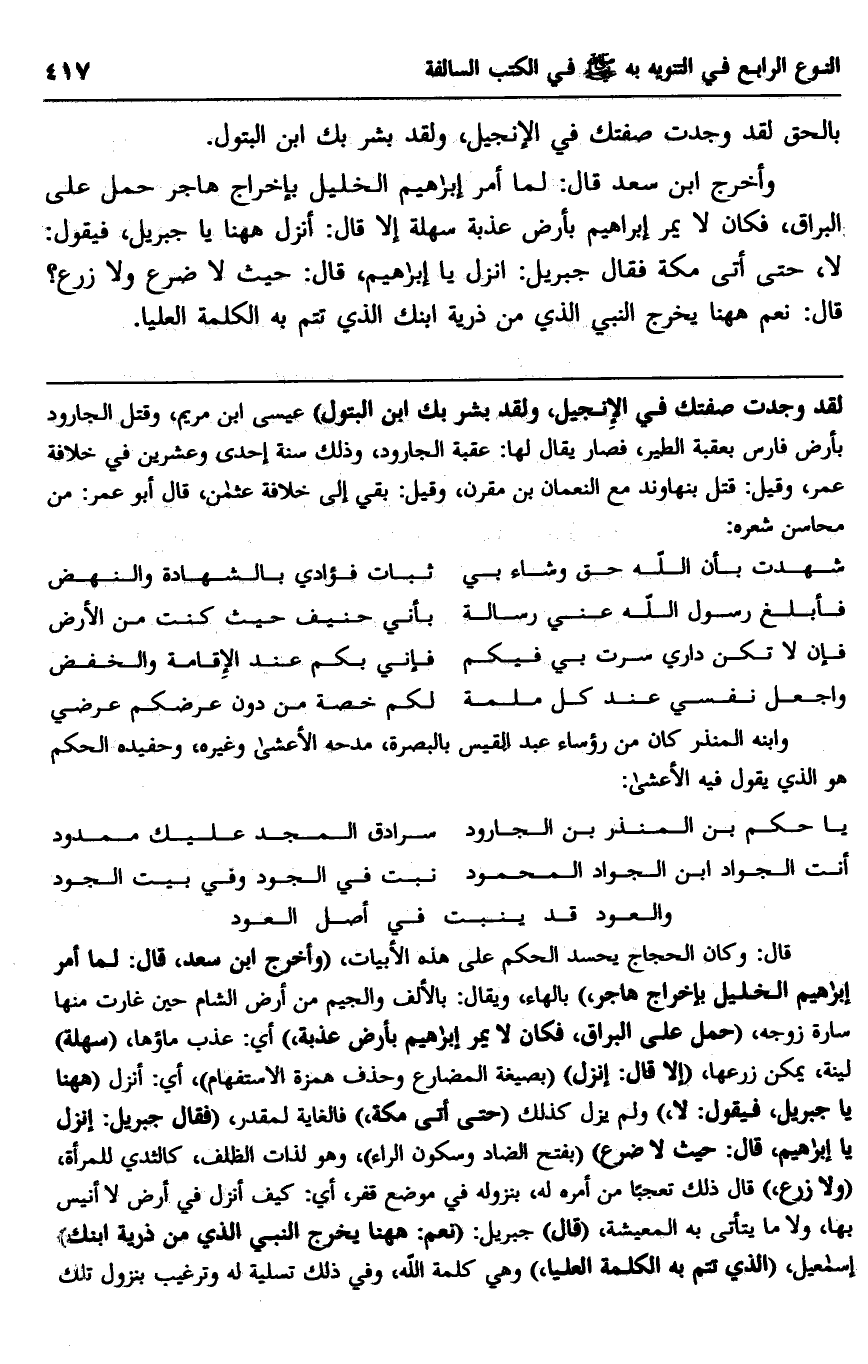 قال: وكان الحجاج يحسد الحكم على هذه الأبيات، "وأخرج ابن سعد، قال: لما أمر إبراهيم الخليل بإخراج هاجر" بالهاء، ويقال: بالألف والجيم من أرض الشام حين غارت منها سارة زوجه، "حمل على البراق، فكان لا يمر إبراهيم بأرض عذبة"، أي: عذب ماؤها، "سهلة" لينة، يمكن زرعها، "إلا قال: انزل" "بصيغة المضارع وحذف همزة الاستفهام" أي: انزل "ههنا يا جبريل، فيقول: لا" ولم يزل كذلك "حتى أتى مكة" فالغاية لمقدر، "فقال جبريل: انزل يا إبراهيم، قال: حيث لا ضرع" "بفتح الضاد وسكون الراء" وهو لذات الظلف، كالثدي للمرأة، "ولا زرع" قال ذلك تعجبًا من أمره له، بنزوله في موضع قفر، أي: كيف أنزل في أرض لا أنيس بها، ولا ما يتأتى به المعيشة، "قال" جبريل: "نعم: ههنا يخرج النبي الذي من ذرية ابنك إسماعيل، "الذي تتم به الكلمة العليا" وهي كلمة الله، وفي ذلك تسلية له وترغيب بنزول تلك