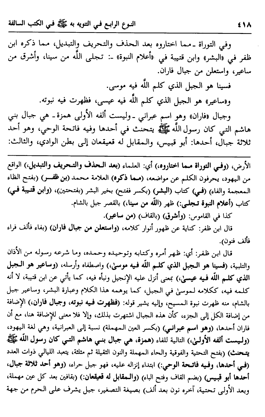 قال ابن ظفر: أي: ظهر أمره وكتابه وتوحيده وحمده، وما شرعه رسوله من الأذان والتلبية، "فسينا هو الجبل الذي كلم الله فيه موسى" واصطفاه وأرسله، "وساعير هو الجبل الذي كلم الله في عيسى" بمعنى أنزل عليه الإنجيل ونبأه فيه، كما يأتي عن ابن قتيبة، لا أنه كلمه فيه، ككلامه لموسى في الجبل، كما يوهمه هذا الكلام وعبارة البشر، وساعير جبل بالشام، منه ظهرت نبوة المسيح، وإليه بشير قوله: "فظهرت فيه نبوته، وجبال فاران" الإضافة من إضافة الكل إلى الجزء، كأن هذه الجبال اشتهرت بذلك، وإلا فلا معنى للإضافة هنا، مع أن فاران أحدها، "وهو اسم عبراني" "بكسر العين المهملة" نسبة إلى العبرانية، وهي لغة اليهود "وليست ألفه الأولى"، التالية للفاء "همزة، هي جبال بني هاشم التي كان رسول الله صلى الله عليه وسلم يتحنث" "بفتح التحتية والفوقية والحاء المهملة والنون الثقيلة ثم مثلثة، يتعبد الليالي ذوات العدد "في أحدها، وفيه فاتحة الوحي" ابتداء إنزاله عليه، فهو جبل حراء، "وهو أحد ثلاثة جبال، أحدها أبو قيس" "بضم القاف وفتح الباء" "والمقابل له قعيقعان" "بقافين بعد كل عين مهملة، وبعد الأولى تحتية، آخره نون بعد ألف" بصيغة التصغير، جبل يشرف على الحرم من جهة