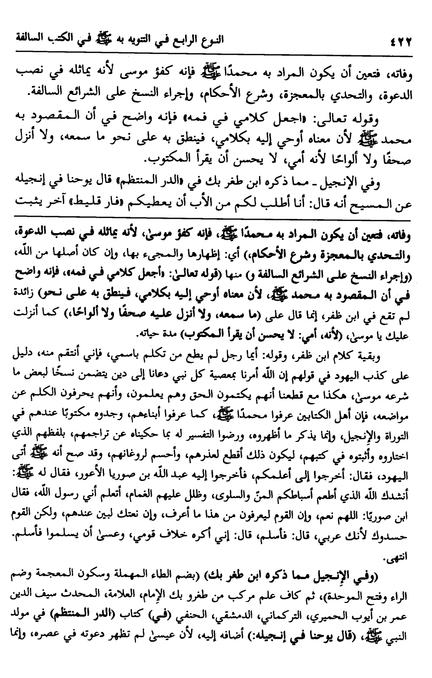 وبقية كلام ابن ظفر، وقوله: أيما رجل لم يطع من تكلم باسمي، فإني أنتقم منه، دليل على كذب اليهود في قولهم: إن الله أمرنا بمعصية كل نبي دعانا إلى دين يتضمن نسخًا لبعض ما شرعه موسى، هكذا مع قطعنا أنهم يكتمون الحق وهم يعلمون، وأنهم يحرفون الكلم عن مواضعه، فإن أهل الكتابين عرفوا محمدًا صلى الله عليه وسلم، كما عرفوا أبناءهم، وجدوه مكتوبًا عندهم في التوراة والإنجيل، وإنما يذكر ما أظهروه، ورضوا التفسير له بما حكيناه عن تراجمهم، بلفظهم الذي اختاروه وأثبتوه في كتبهم، ليكون ذلك أقطع لعذرهم، وأحسم لروغانهم، وقد صح أنه صلى الله عليه وسلم أتى اليهود، فقال: أخرجوا إلى أعلمكم، فأخرجوا إليه عبد الله بن صوريا الأعور، فقال له صلى الله عليه وسلم: "أنشدك الله الذي أطعم أسباطكم المن والسلوى، وظلل عليهم الغمام، أتعلم أني رسول الله"، فقال ابن صوريا: اللهم نعم، وإن القوم ليعرفون من هذا ما أعرف، وإن نعتك لبين عندهم، ولكن القوم حسدوك؛ لأنك عربي، قال: فأسلم، قال: إني أكره خلاف قومي، وعسى أن يسلموا فأسلم، انتهى.