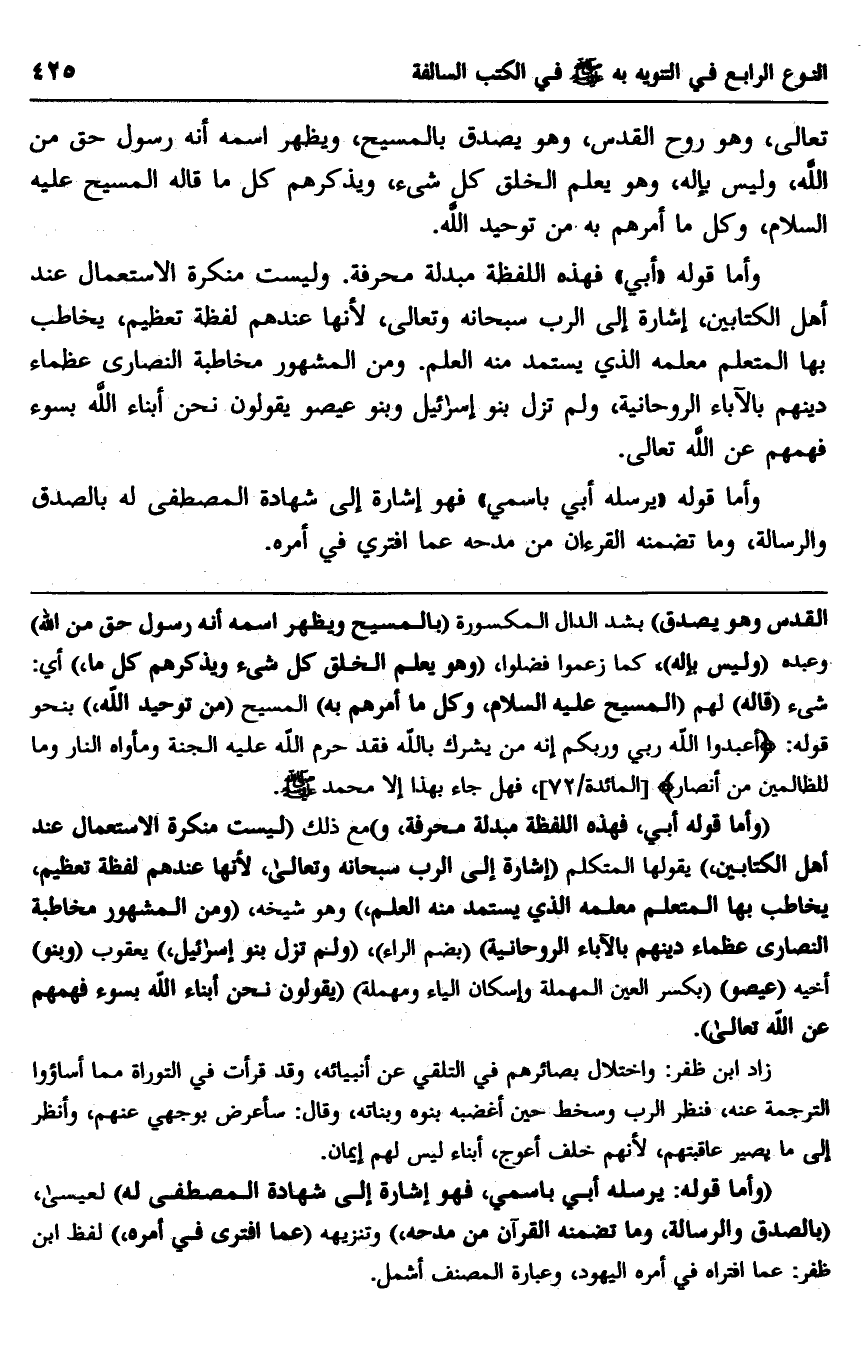 "وأما قوله: "أبي" فهذه اللفظة مبدلة محرفة، و" ومع ذلك "ليست منكرة الاستعمال عند أهل الكتابين" يقولها المتكلم "إشارة إلى الرب سبحانه وتعالى؛ لأنها عندهم لفظة تعظيم، يخاطب بها المتعلم معلمه الذي يستمد منه العلم" وهو شيخه، "ومن المشهور مخاطبة النصارى عظماء دينهم بالآباء الروحانية" "بضم الراء"، "ولم عتزل بنو إسرائيل" يعقوب "وبنو" "عيصو" "بكسر العين المهملة وإسكان الياء ومهملة" "يقولون: نحن أبناء الله بسوء فهمهم عن الله تعالى".