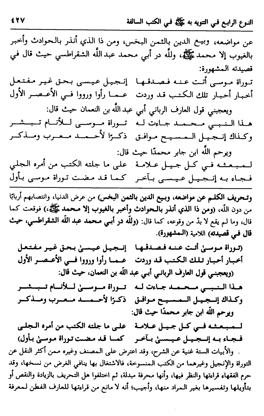 والأبيات الستة غنية عن الشرح، وقد اعترض على المصنف وغيره ممن أكثر النقل عن التوراة والإنجيل وغيرهما من الكتب المنسوخة، فالاشتغال بها ينافي الغرض من نسخها، وقد حرم الفقهاء قراءتها والنظر فيها، وأنها محرفة مبدلة، ثم اختلفوا هل التحريف بالزيادة والنقص بتأويلها وتفسيرها بغير المراد منها، وأجيب؛ أنه لا مانع من قراءتها للعارف الفطن لمعرفة