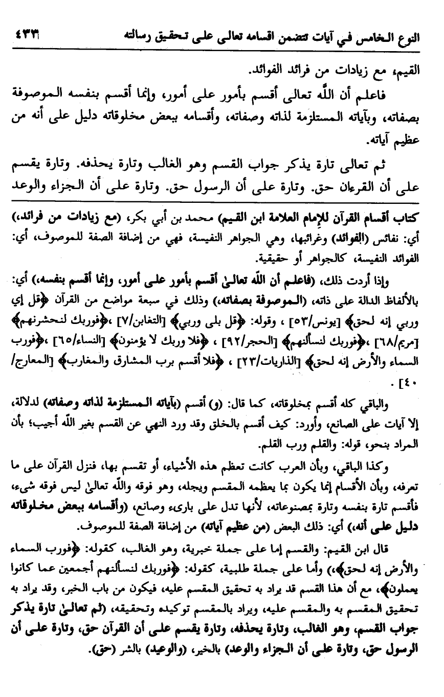 وإذا أردت ذلك، "فأعلم أن الله تعالى أقسم بأمور على أمور، وإنما أقسم بنفسه"، أي: بالألفاظ الدالة على ذاته، "الموصوفة بصفاته"، وذلك في سبعة مواضع من القرآن {قُلْ إِي وَرَبِّي إِنَّهُ لَحَق} [يونس: 53] ، وقوله: {قُلْ بَلَى وَرَبِّي} [التغابن: 7] ، {فَوَرَبِّكَ لَنَحْشُرَنَّهُم} [مريم: 68] ، {فَوَرَبِّكَ لَنَسْأَلَنَّهُمْ} [الحجر: 92] ، {فَلا وَرَبِّكَ لا يُؤْمِنُون} [النساء: 65] ، {فَوَرَبِّ السَّمَاءِ وَالْأَرْضِ إِنَّهُ لَحَقٌّ} [الذاريات: 23] ، {فَلا أُقْسِمُ بِرَبِّ الْمَشَارِقِ وَالْمَغَارِبِ} [المعارج: 40] .