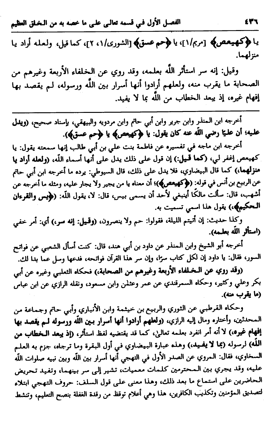 وحكاه القرطبي عن الثوري والربيع بن خيثمة وابن الأنباري وأبي حاتم وجماعة من المحدثين، واختاره ومال إليه الرازي، "ولعلهم أرادوا أنها أسرار بين الله ورسوله لم يقصد بها إفهام غيره" لا أنه أمر انفرد بعلمه تعالى، كما قد يقتضيه لفظ استأثر، "إذ يبعد الخطاب من الله" لرسوله "بما لا يفيد" وهذه عبارة البيضاوي في أول البقرة وما ترجاه، جزم به العلم السخاوي، فقال: المروي عن الصدر الأول في التهجي أنها أسرار بين الله وبين نبيه صلوات الله عليه، وقد يجري بين المحترمين كلمات معميات، تشير إلى سر بينهما، وتفيد تحريض الحاضرين على استماع ما بعد ذلك، وها معنى على قول السلف: حروف التهجي ابتلاء لتصديق المؤمنين وتكذيب الكافرين، هذا وهي أعلام توقظ من رقدة الغفلة بنصح التعليم، وتنشط