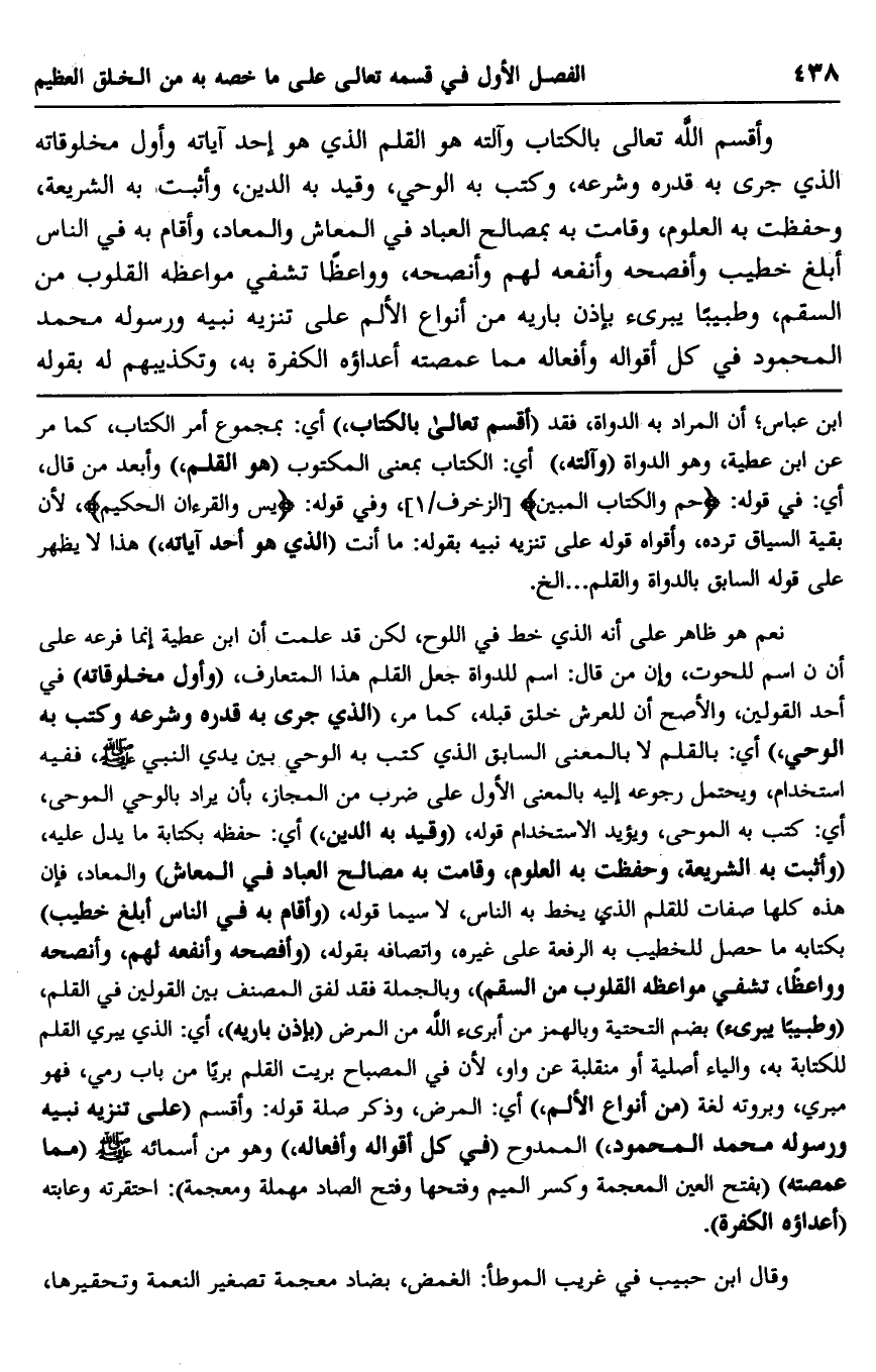 وأقسم الله تعالى بالكتاب وآلته هو القلم الذي هو إحد آياته وأول مخلوقاته الذي جرى به قدره وشرعه، وكتب به الوحي، وقيد به الدين، وأثبت به الشريعة، وحفظت به العلوم، وقامت به بمصالح العباد في المعاش والمعاد، وأقام به في الناس أبلغ خطيب وأفصحه وأنفعه لهم وأنصحه، وواعظًا تشفي مواعظه القلوب من السقم، وطبيبًا يبرئ بإذن باريه من أنواع الألم على تنزيه نبيه ورسوله محمد المحمود في كل أقواله، وأفعاله مما عمصته أعداؤه الكفرة به، وتكذيبهم له بقوله
