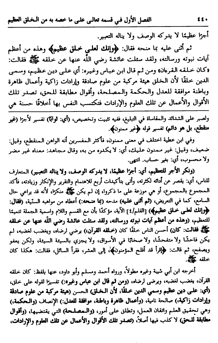 ثم أثنى عليه بما منحه فقال: {وَإِنَّكَ لَعَلى خُلُقٍ عَظِيمٍ} وهذه من أعظم آيات نبوته ورسالته، ولقد سئلت عائشة رضي الله عنها عن خلقه صلى الله عليه وسلم فقالت: "كان خلقه القرآن" ومن ثم قال ابن عباس وغيره: أي على دين عظيم، وسمي الدين خلقًا؛ لأن الخلق هيئة مركبة من علوم صادقة وإرادات زاكية وأعمال ظاهرة وباطنة موافقة للعدل والحكمة والمصلحة، وأقوال مطابقة للحق، تصدر تلك الأقوال والأعمال عن تلك العلوم والإرادات فتكسب النفس بها أخلاقًا حسنة هي