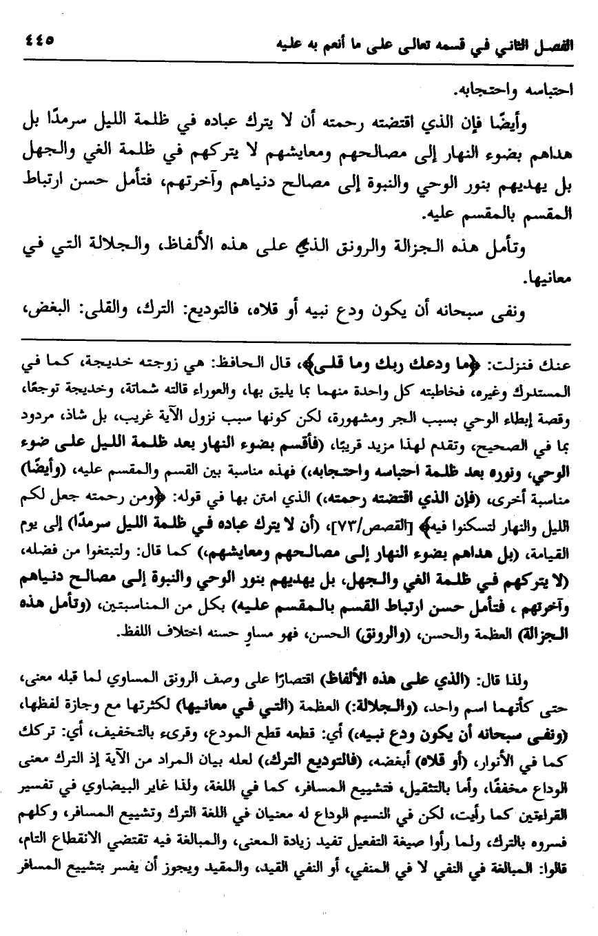 وأيضًا فإن الذي اقتضته رحمته أن لا يترك عباده في ظلمة الليل سرمدًا بل هداهم بضوء النهار إلى مصالحهم، ومعايشهم لا يتركهم في ظلمة الغي والجهل بل يهديهم بنور الوحي والنبوة إلى مصالح دنياهم وآخرتهم، فتأمل حسن ارتباط المقسم بالمقسم عليه.