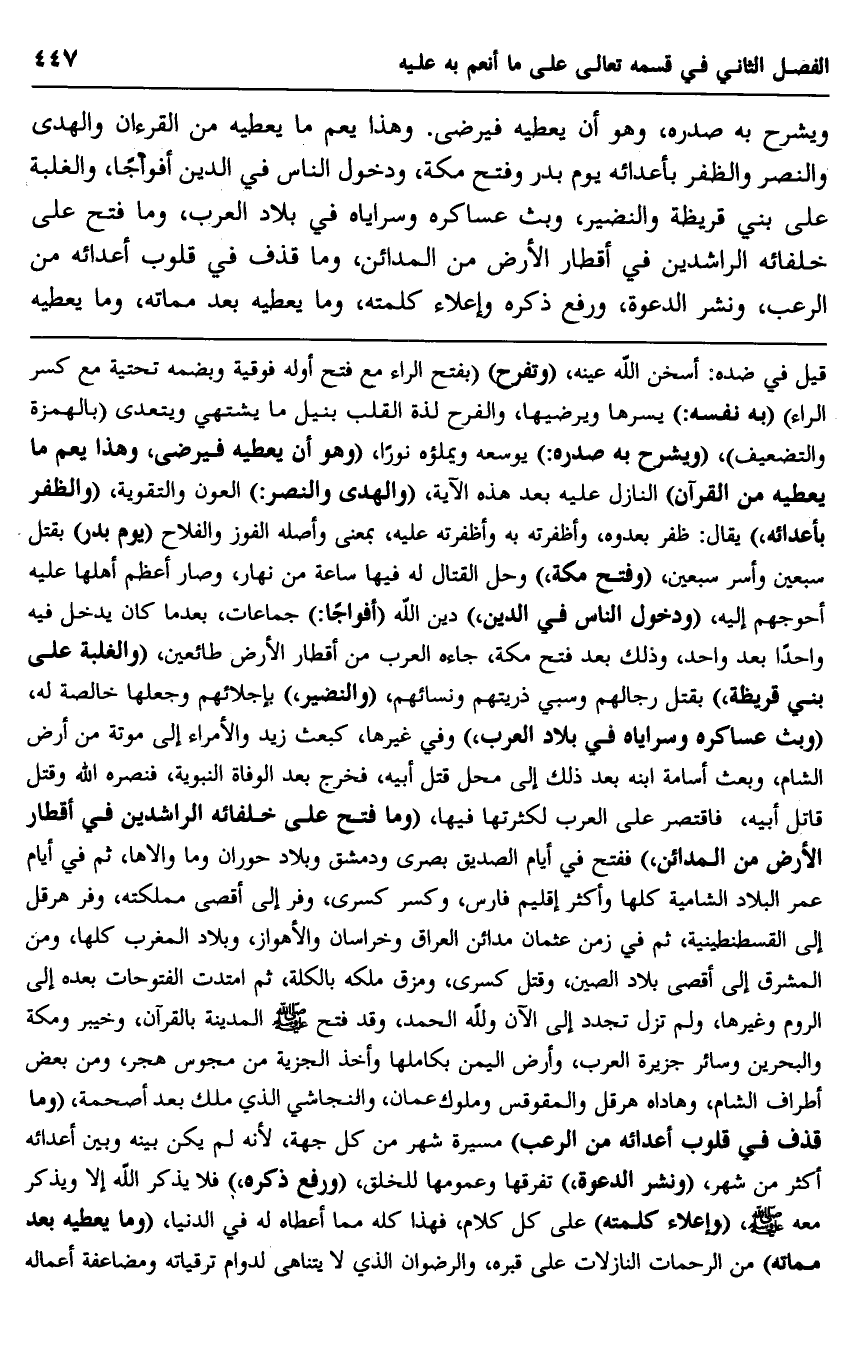 قيل في ضده: أسخن الله عينه، "وتفرح" "بفتح الراء مع فتح أوله فوقية وبضمه تحتية مع كسر الراء" "به نفسه": يسرها ويرضيها، والفرح لذة القلب بنيل ما يشتهي ويتعدى "بالهمزة والتضعيف"، "وبشرح به صدره" يوسعه ويملؤه نورًا، "وهو أن يعطيه فيرضى، وهذا يعم ما يعطيه من القرآن" النازل عليه بعد هذه الآية، "والهدى والنصر": العون والتقوية، "والظفر بأعدائه" يقال: ظفر بعدوه، وأظفرته به وأظفرته عليه، بمعنى وأصله الفوز والفلاح "يوم بدر" بقتل سبعين وأسر سبعين، "وفتح مكة" وحل القتال له فيها ساعة من نهار، وصار أعظم أهلها عليه أحوجهم إليه، "ودخول الناس في الدين" دين الله "أفواجًا" جماعات، بعدما كان يدخل فيه واحدًا بعد واحد، وذلك بعد فتح مكة، جاءه العرب من أقطار الأرض طائعين، "والغلبة على بني قريظة" بقتل رجالهم وسبي ذريتهم ونسائهم، "والنضير" بإجلائهم وجعلها خالصة له، "وبث عساكره وسراياه في بلاد العرب" وفي غيرها، كبعث زيد والأمراء إلى موته من أرض الشام، وبعث أسامة ابنه بعد ذلك إلى محل قتل أبيه، فخرج بعد الوفاة النبوية، فنصره الله وقتل قاتل أبيه، فاقتصر على العرب لكثرتها فيها، "وما فتح على خلفائه الراشدين في أقطار الأرض من المدائن"، ففتح في أيام الصديق بصرى ودمشق وبلاد حوران وما والاها، ثم في أيام عمر البلاد الشامية كلها وأكثر إقليم فارس، وكسر كسرى، وفر إلى أقصى مملكته، وفر هرقل إلى القسطنطينية، ثم في زمن عثمان مدائن العراق وخراسان والأهواز، وبلاد المغرب كلها، ومن المشرق إلى أقصى بلاد الصين، وقتل كسرى، ومزق ملكه بالكلة، ثم امتدت الفتوحات بعده إلى الروم وغيرها، ولم تزل تجدد إلى الآن ولله الحمد، وقد فتح صلى الله عليه وسلم المدينة بالقرآن، وخيبر ومكة والبحرين وسائر جزيرة العرب، وأرض اليمن بكاملها وأخذ الجزية من مجوس هجر، ومن بعض أطراف الشام، وهاداه هرقل والمقوقس وملوك عمان، والنجاشي الذي ملك بعد أصحمة، "وما قذف في قلوب أعدائه من الرعب" مسيرة شهر من كل جهة؛ لأنه لم يكن بينه وبين أعدائه أكثر من شهر، "ونشر الدعوة" تفرقها وعمومها للخلق، "ورفع ذكره" فلا يذكر الله إلا ويذكر معه صلى الله عليه وسلم، "وإعلاء كلمته" على كل كلام، فهذا كله مما أعطاه له في الدنيا، "وما يعطيه بعد مماته" من الرحمات النازلات على قبره، والرضوان الذي لا يتناهى لدوام ترقياته ومضاعفة أعماله