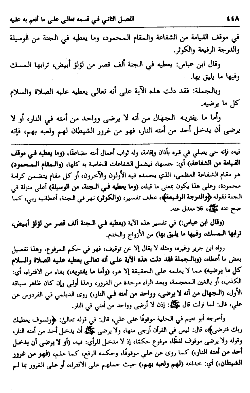 رواه ابن جرير وغيره، ومثله لا يقال إلا عن توقيف، فهو في حكم المرفوع، وهذا تفصيل بعض ما أعطاه، "وبالجملة فقد دلت هذه الآية على أنه تعالى يعطيه عليه الصلاة والسلام كل ما يرضيه" مما لا يعلمه على الحقيقة إلا هو، "وأما ما يفتريه" بفاء من الافتراء، أي: الكذب، أو بالغين بالمعجمة، وبعد الراء موحدة من الغرور، وهذا أولى وإن كان ظاهر سياقه الأول، "الجهال من أنه لا يرضى، وواحد من أمته في النار"، روى الديلمي في الفردوس عن علي، قال: لما نزلت قال صلى الله عليه وسلم: "إذن لا أرضى وواحد من أمتي في النار".