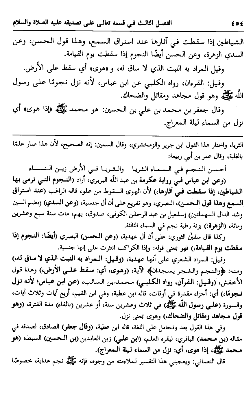 وقال جعفر بن محمد بن علي بن الحسين: هو محمد صلى الله عليه وسلم "إذا هوى" أي نزل من السماء ليلة المعراج.