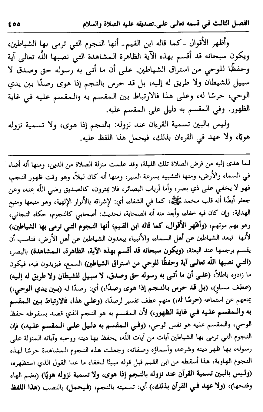 وأظهر الأقوال: -كما قاله ابن القيم- أنها النجوم التي ترمى بها الشياطين، ويكون سبحانه قد أقسم بهذه الآية الظاهرة المشاهدة التي نصبها الله تعالى آية وحفظًا للوحي من استراق الشياطين، على أن ما أتى به رسوله حق وصدق لا سبيل للشيطان ولا طريق له إليه، بل قد حرس بالنجم إذا هوى رصدًا بين يدي الوحي، حرسًا له، وعلى هذا فالارتباط بين المقسم به والمقسم عليه في غاية الظهور، وفي المقسم به دليل على المقسم عليه.