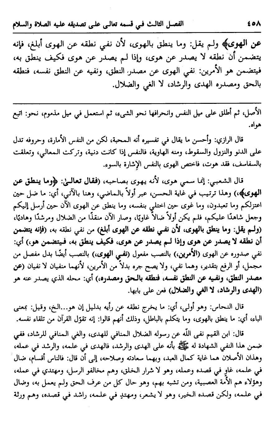 قال الشعبي: إنما سمي هوى؛ لأنه يهوى بصاحبه، "فقال تعالى: {وَمَا يَنْطِقُ عَنِ الْهَوَى} وهذا ترتيب في غاية الحسن، عبر أولًا بالماضي، وهنا بالآتي، أي: ما ضل حين اعتزلكم وما تعبدون، وما غوى حين اختلى بنفسه، وما ينطق عن الهوى الآن حين أرسل إليكم وجعل شاهدًا عليكم، فلم يكن أولًا ضالًا غاويًا، وصار الآن منقذًا من الضلال ومرشدًا وهاديًا، "ولم يقل: وما ينطق بالهوى؛ لأن نفي نطقه عن الهوى أبلغ" من نقي نطقه به، "فإنه يتضمن أن نطقه لا يصدر عن هوى وإذا لم يصدر عن هوى، فكيف ينطق به، فيتضمن هو" أي: نفي صدوره عن الهوى "الأمرين" بالنصب مفعول "نفي الهوى" بالنصب أيضًا بدل مفصل من مجمل، أو الرفع بتقدير، وهما نفي، ولا يصح جره بدلًا من الأمرين؛ لأنهما منفيان لا نفيان "عن مصدر النطق، ونفيه عن النطق نفسه، فنطقه بالحق ومصدره"، أي: محله الذي يصدر عنه هو "الهدى والرشاد، لا الغي والضلال" فعن على بابها.