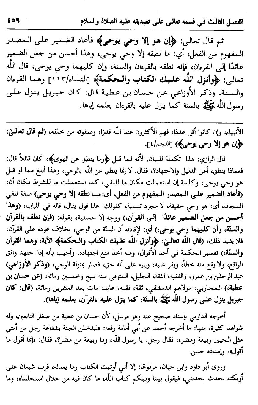 ثم قال تعالى: {إِنْ هُوَ إِلاَّ وَحْيٌ يُوحَى} فأعاد الضمير على المصدر المفهوم من الفعل، أي: ما نطقه إلا وحي يوحى، وهذا أحسن من جعل الضمير عائدًا إلى القرآن، فإنه نطقه بالقرآن والسنة، وإن كليهما وحي يوحى، قال الله تعالى: {وَأَنْزَلَ اللَّهُ عَلَيْكَ الْكِتَابَ وَالْحِكْمَةَ} [النساء: 113] وهما القرآن والسنة، وذكر الأوزاعي عن حسان بن عطية قال: كان جبريل ينزل على رسول الله صلى الله عليه وسلم بالسنة كما ينزل عليه بالقرآن يعلمه إياها.