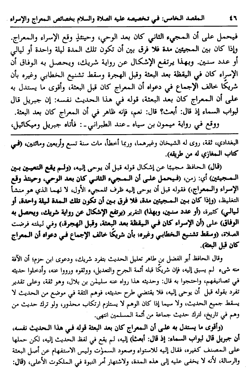 فيحمل على أن المجيء الثاني كان بعد الوحي، وحينئذ وقع الإسراء والمعراج، وإذا كان بين المجيئين مدة فلا فرق بين أن تكون تلك المدة ليلة واحدة، أو ليالي أو عدد سنين، وبهذا يرتفع الإشكال عن رواية شريك، ويحصل به الوفاق أن الإسراء كان في اليقظة بعد البعثة وقبل الهجرة وسقط تشنيع الخطابي وغيره بأن شريكًا خالف الإجماع في دعواه أن المعراج كان قبل البعثة، وأقوى ما يستدل به على أن المعراج كان بعد البعثة، قوله في هذا الحديث نفسه: إن جبريل قال لبواب السماء إذ قال: أبعث؟ قال: نعم، فإنه ظاهر في أن المعراج كان بعد البعثة.