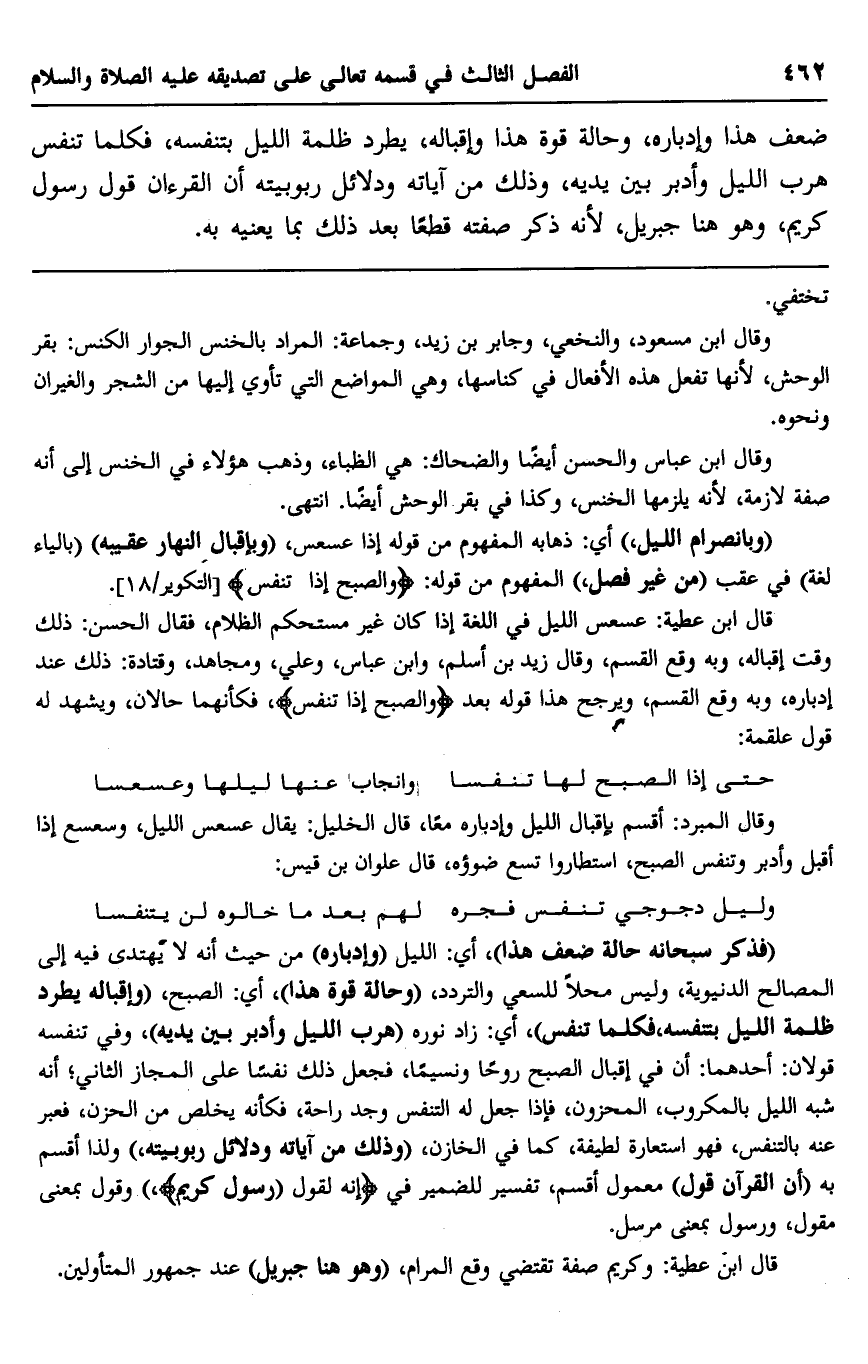 "وبانصرام الليل"، أي: ذهابه المفهوم من قوله: إذا عسعس، "وبإقبال النهار عقيبه" "بالياء لغة" في عقب "من غير فصل"، المفهوم من قوله: {وَالصُّبْحِ إِذَا تَنَفَّس} [التكوير: 18] .